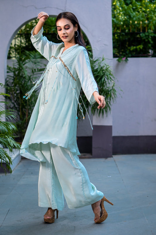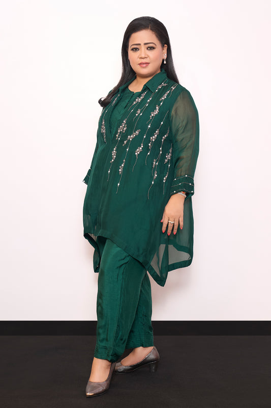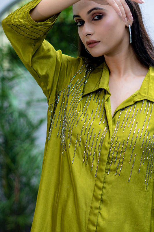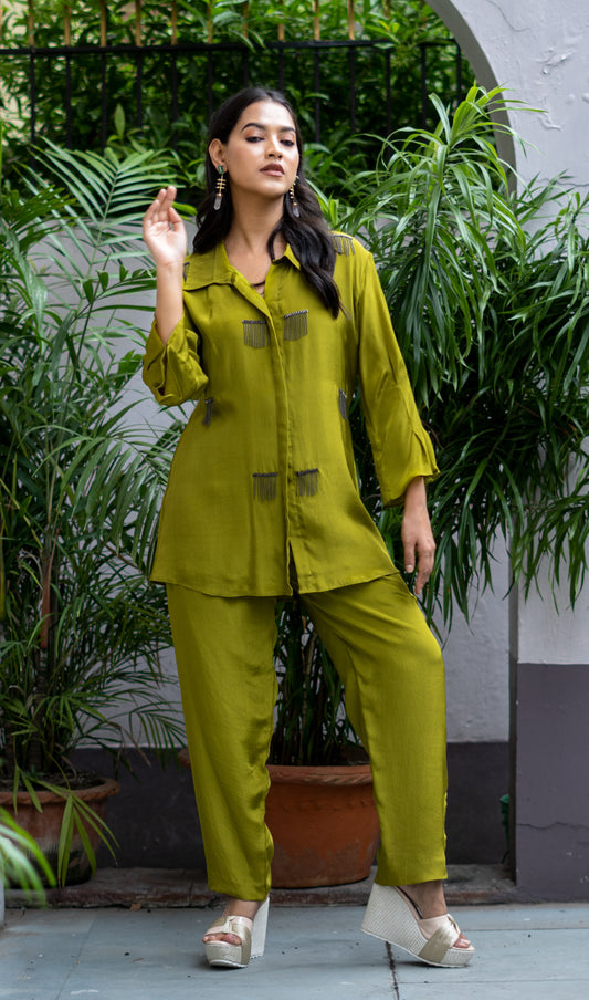 GREEN CORDSET WITH EMBROIDERY IN STRIPS PATTERN