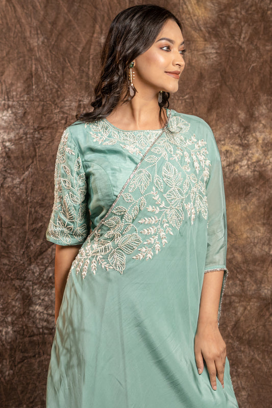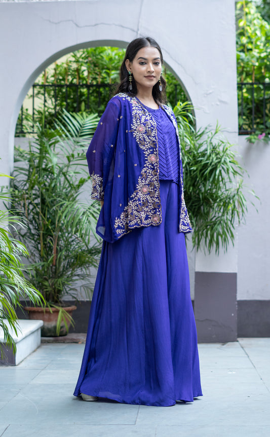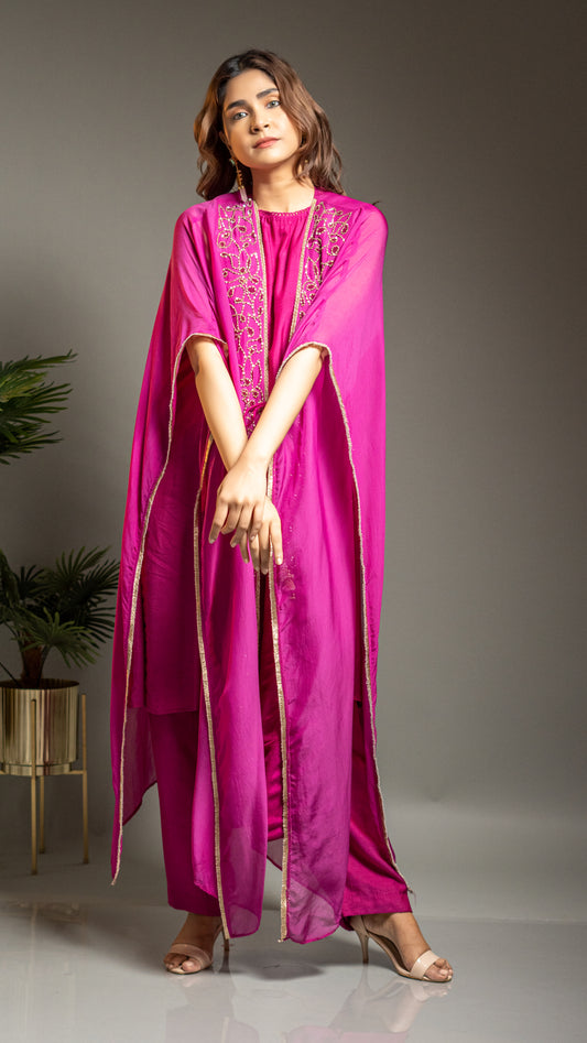 ONE SHOULDER CAPE WITH SKIRT WITH BLOUSE