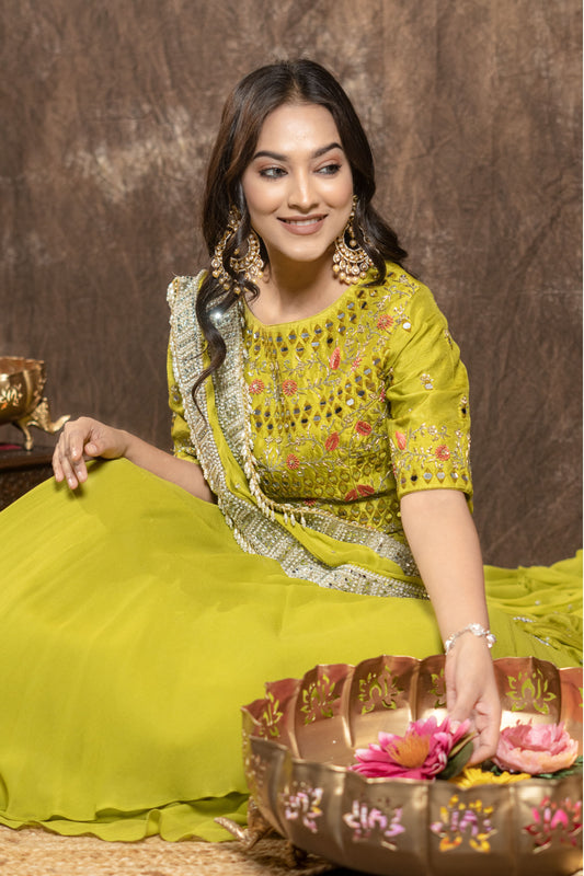 MIRROR GREEN LAYERED LEHENGHA