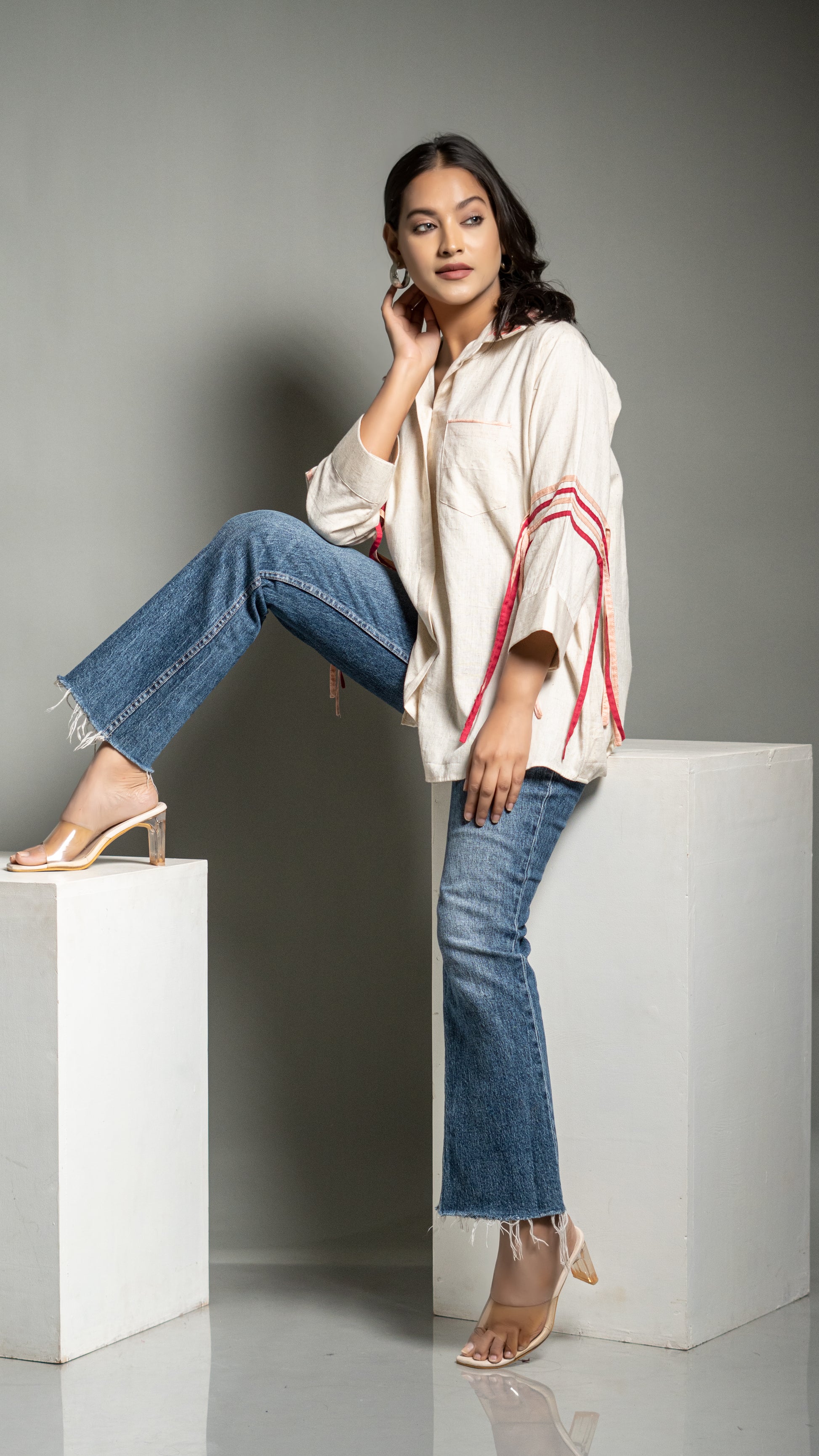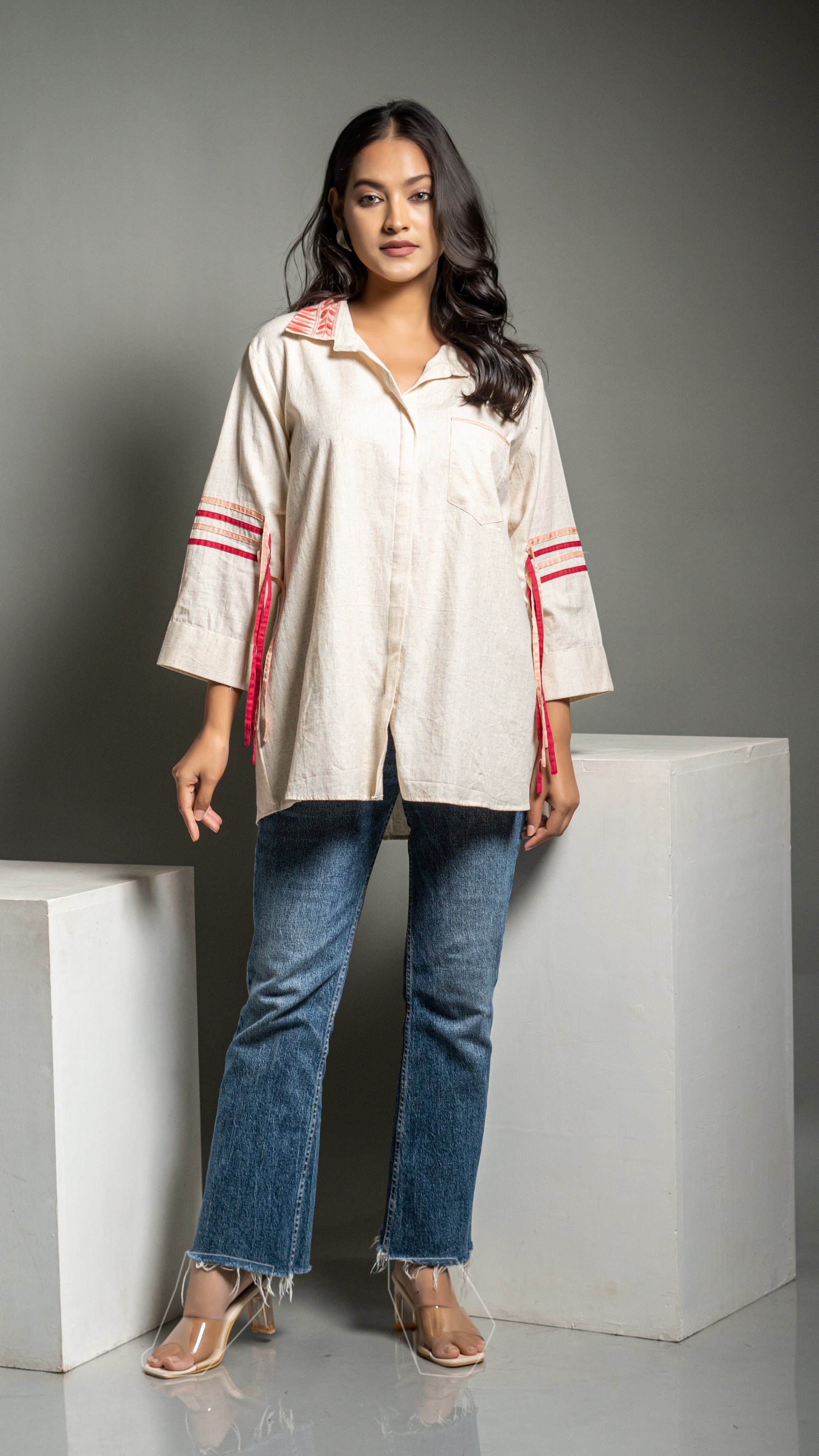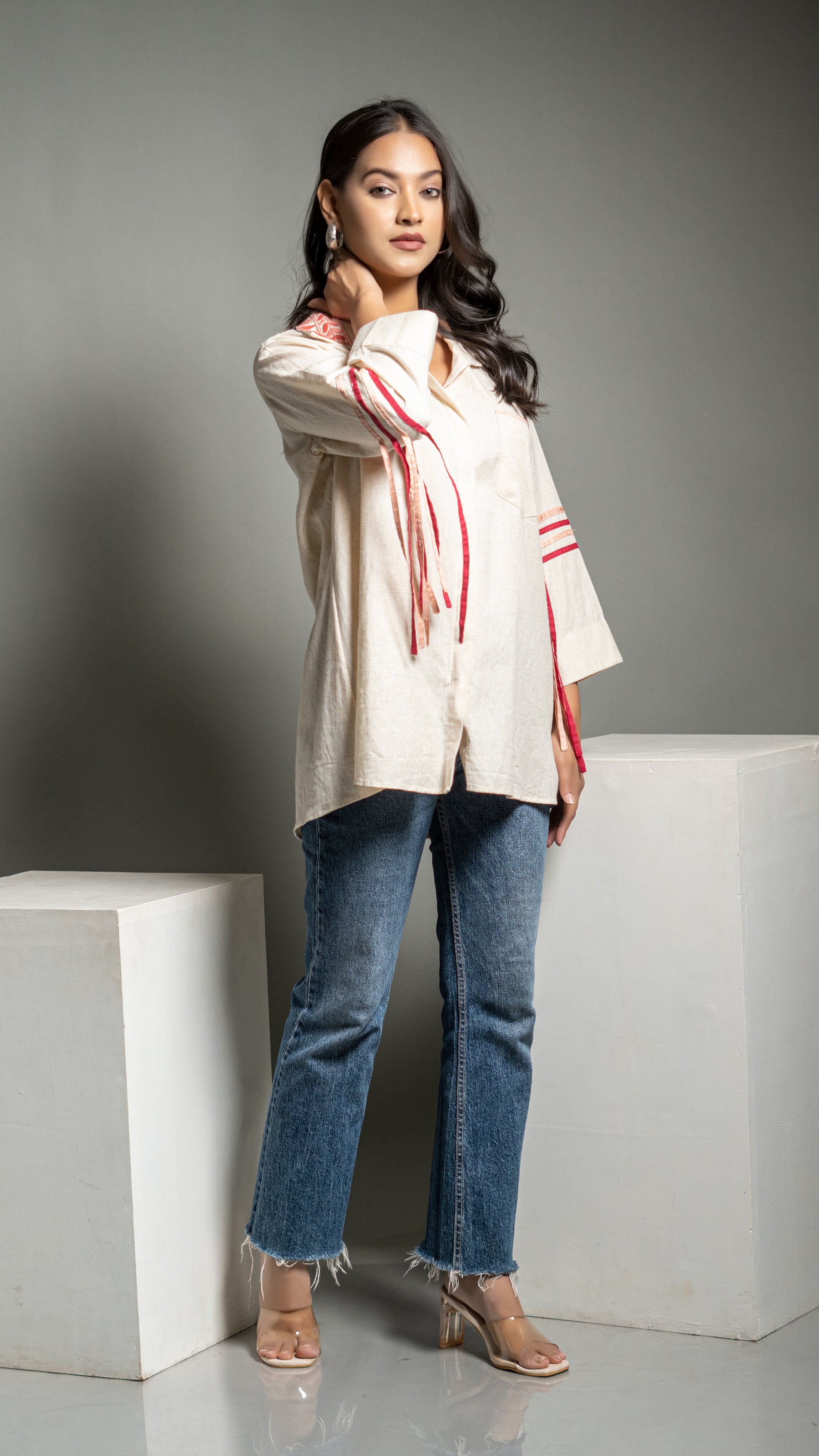 Expertly crafted with thread embroidery on the collar and detailed stitching on the sleeves, this shirt exudes sophistication and elegance. Elevate your wardrobe and add a touch of style with this beautifully designed piece.