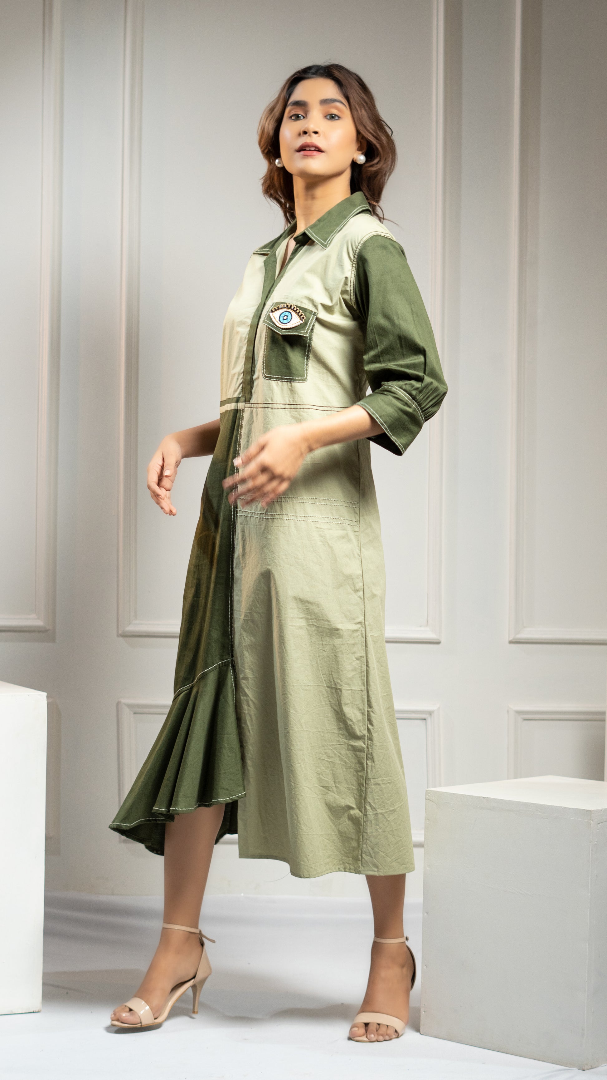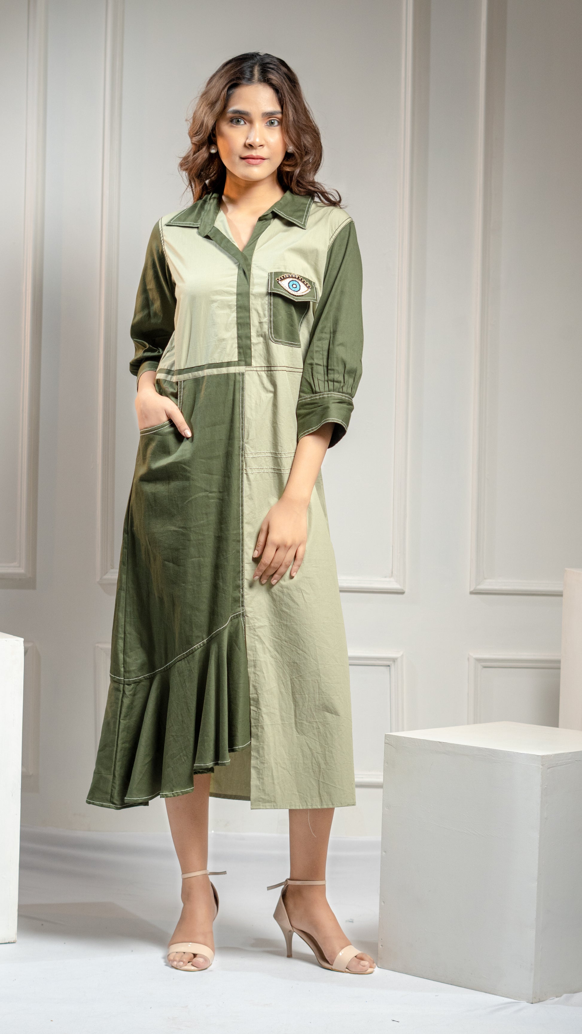 This colour block dress features a striking evil eye motif, adding a touch of uniqueness to your wardrobe. The bold design is sure to make a statement and the high-quality fabric ensures both comfort and style. Expertly crafted, this dress is a must-have for any fashion-forward individual.