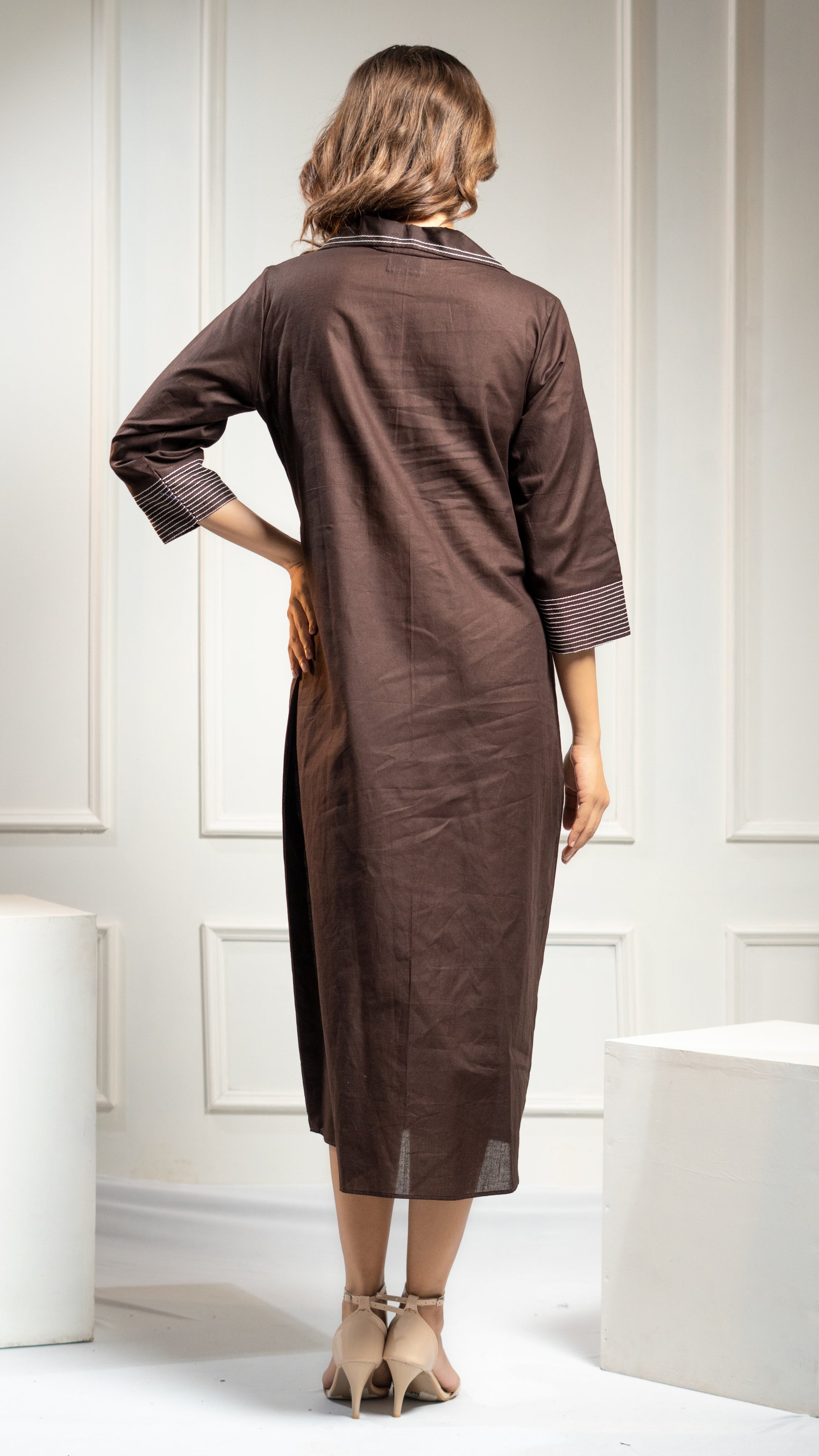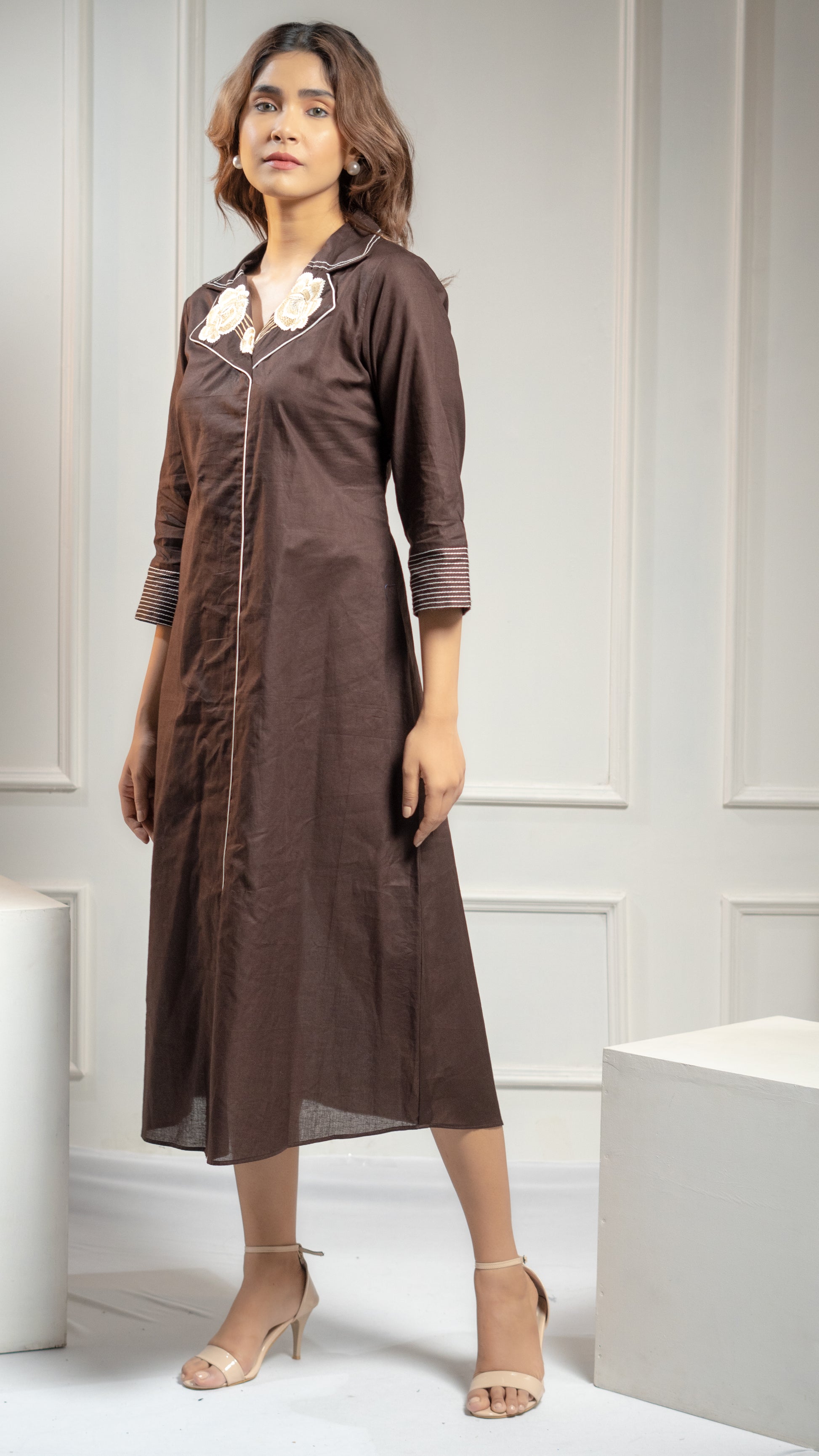 Create a sophisticated and stylish look with our Cotton Dress. This chic and elegant one piece features a beautiful floral embroidery on the collar. Elevate your fashion game with this versatile and trendy dress.