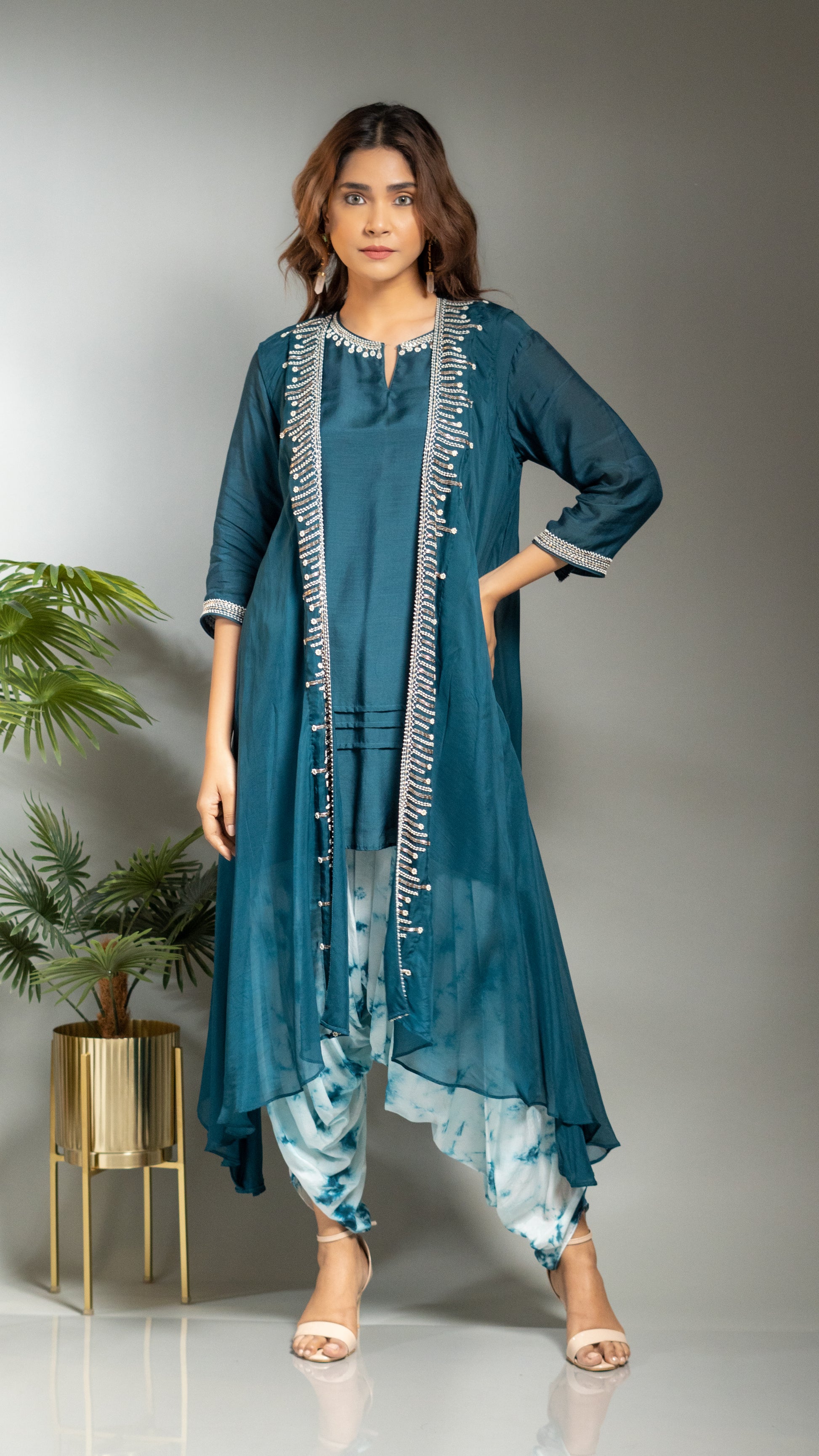Elevate your style with our Pearl Hand Embroided Silk Organza Jacket Set. The jacket features intricate embroidery and is paired with a luxurious silk muslin inner and bomb dye dhoti pants for a perfect match. Indulge in the elegance and comfort of this set.