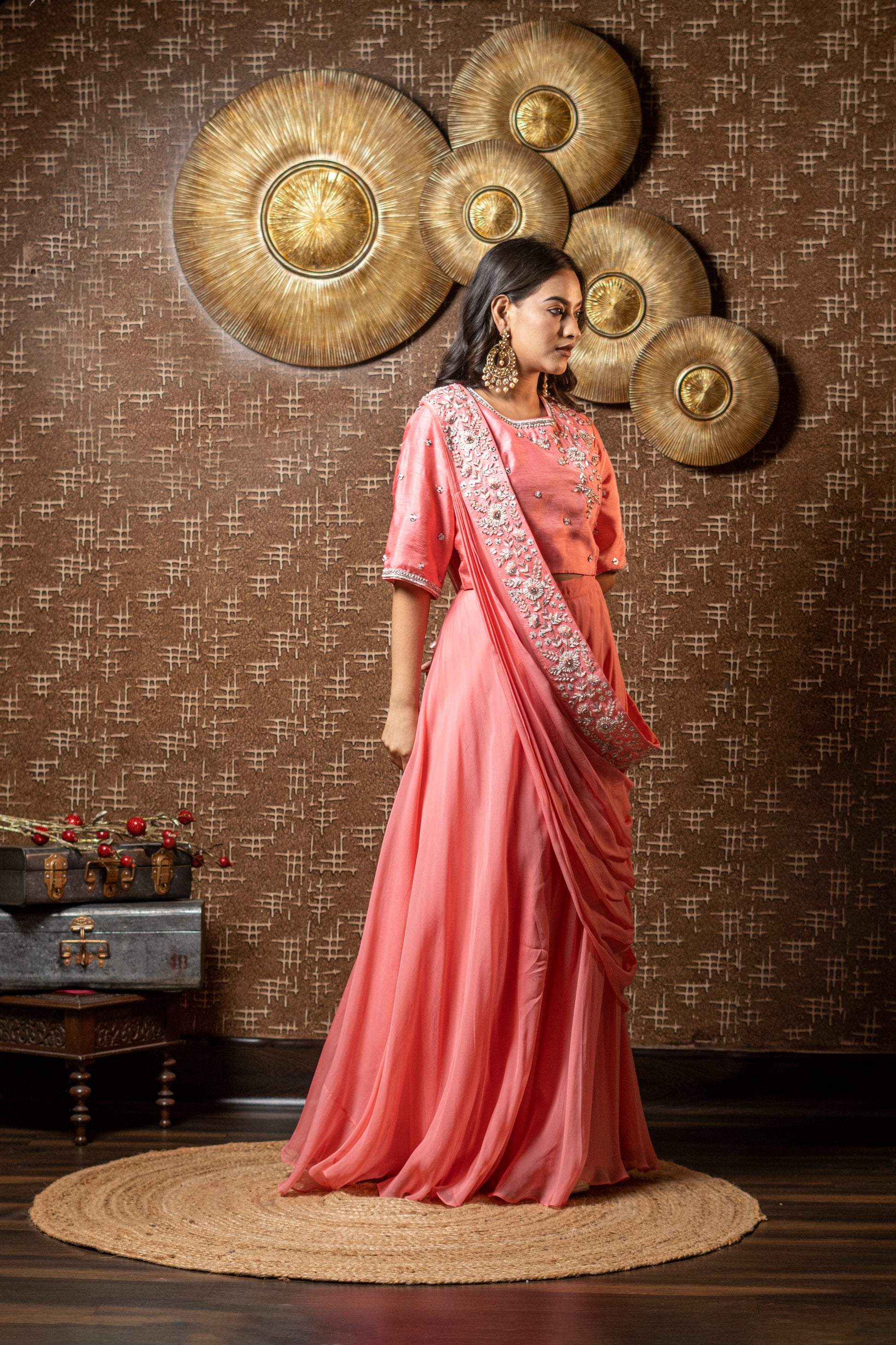 DRAPED DUPATTA WITH SHORT BLOUSE AND FLAIRED PANTS