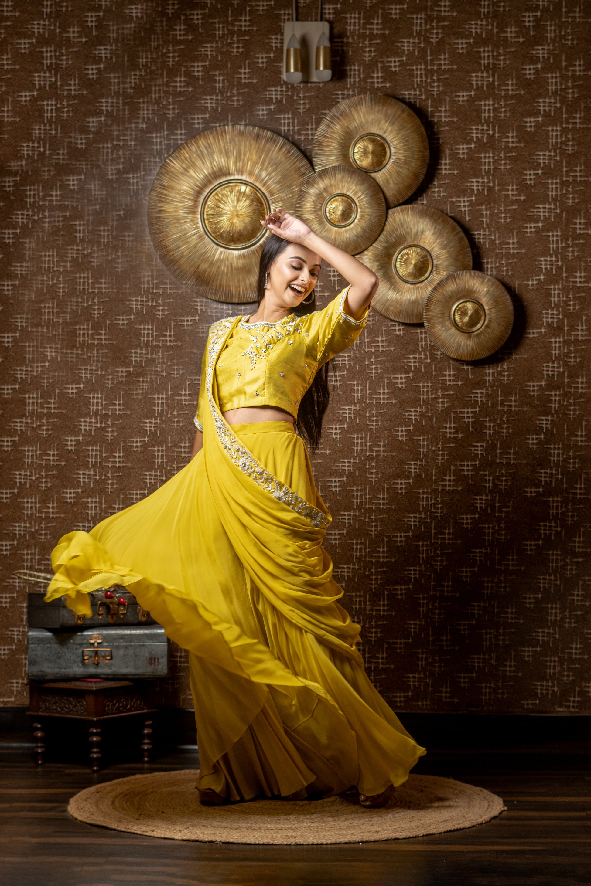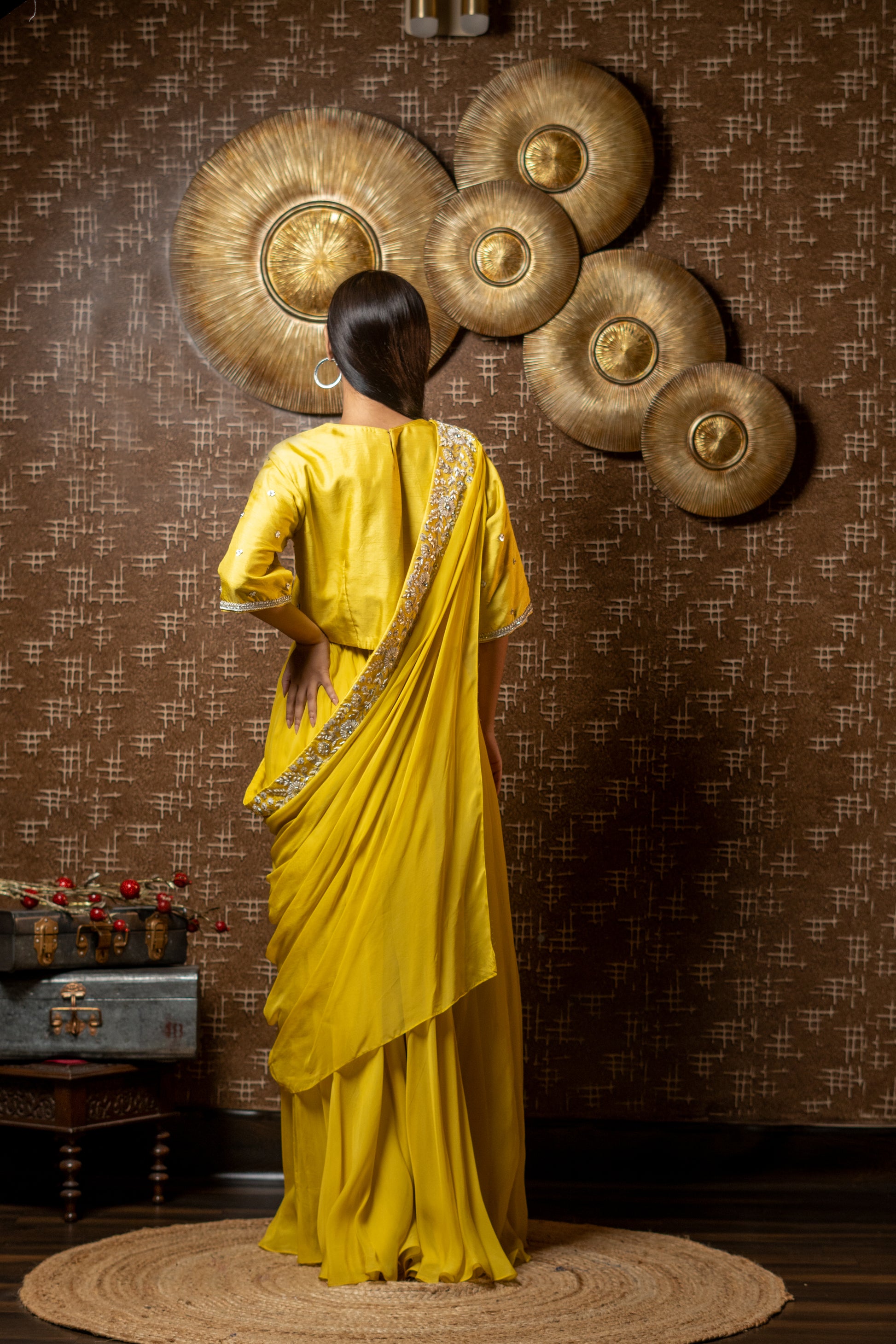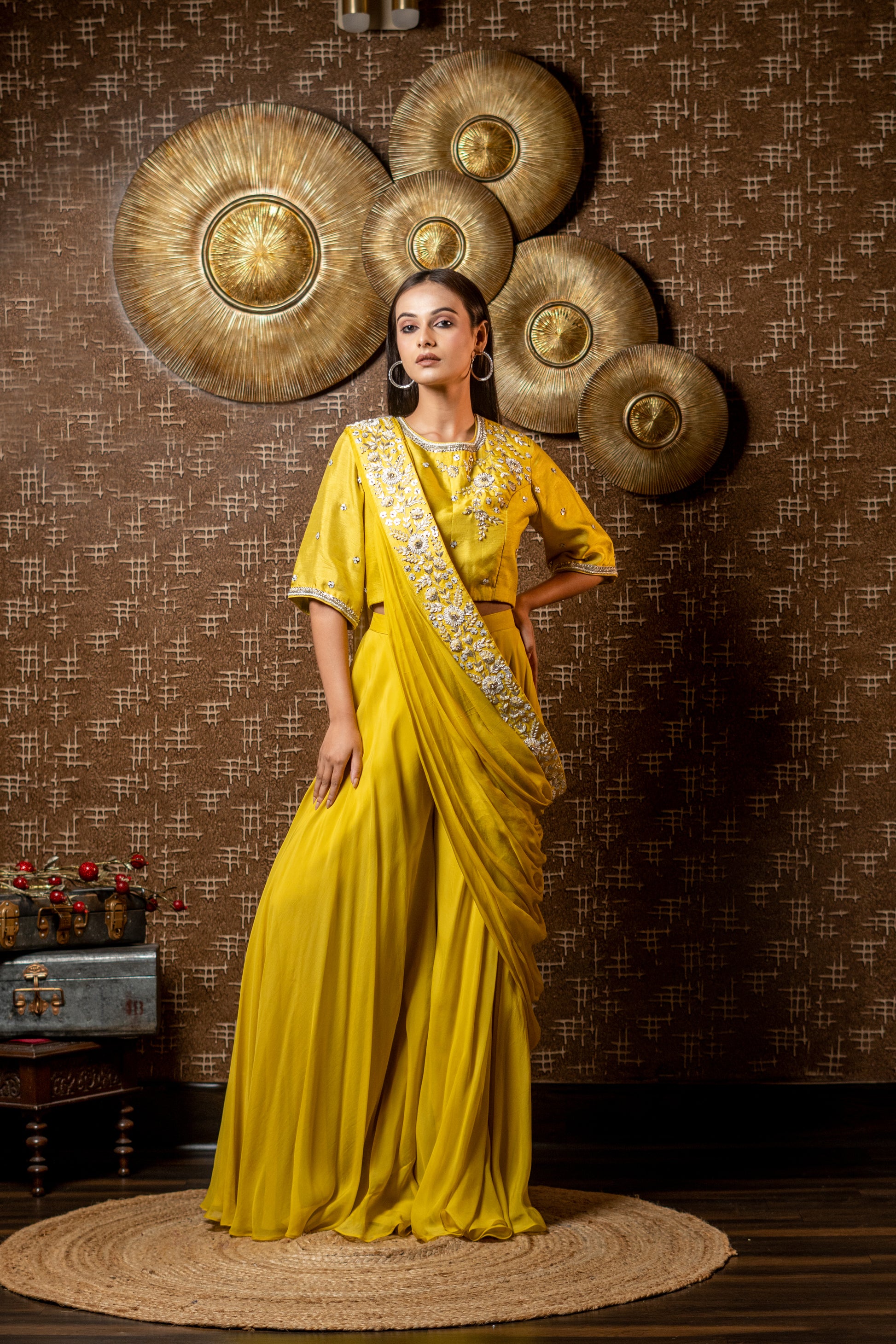 DRAPED DUPATTA WITH SHORT BLOUSE AND FLAIRED PANTS