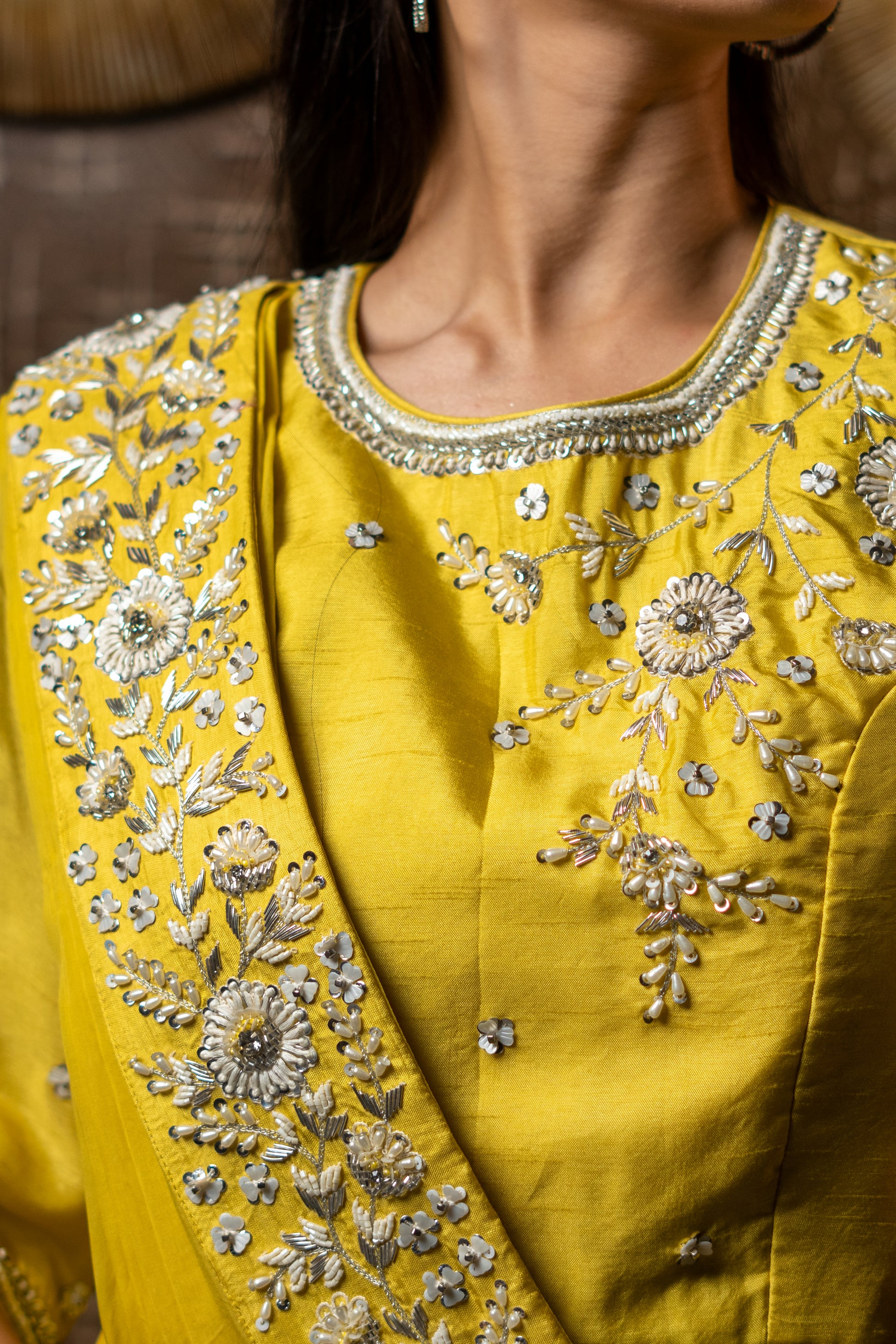 Elevate your ethnic wardrobe with our Draped Dupatta set. Featuring stunning thread, pearl, and aari embroidery on the blouse and dupatta, paired with stylish flared pants. Perfect for any occasion, feel confident and stylish in this unique and timeless ensemble.