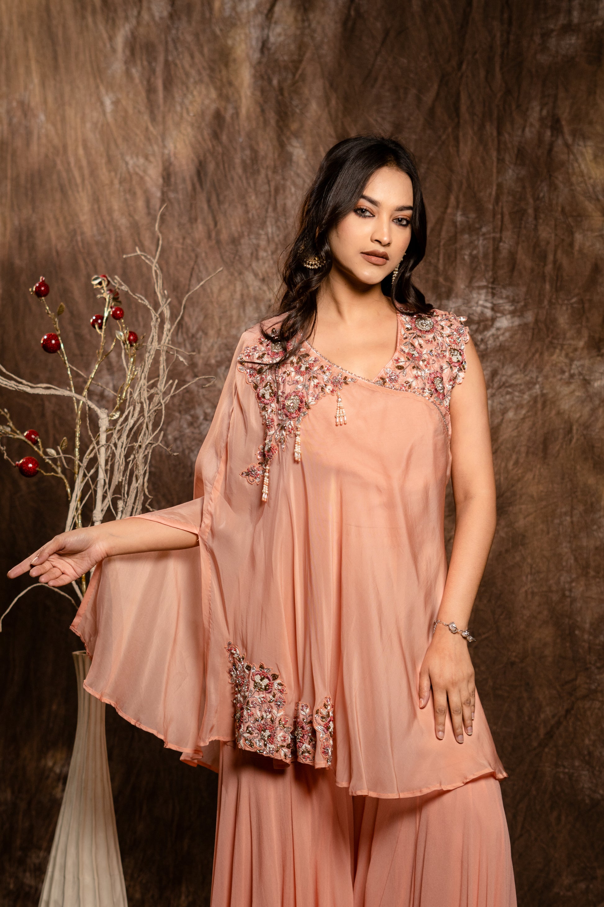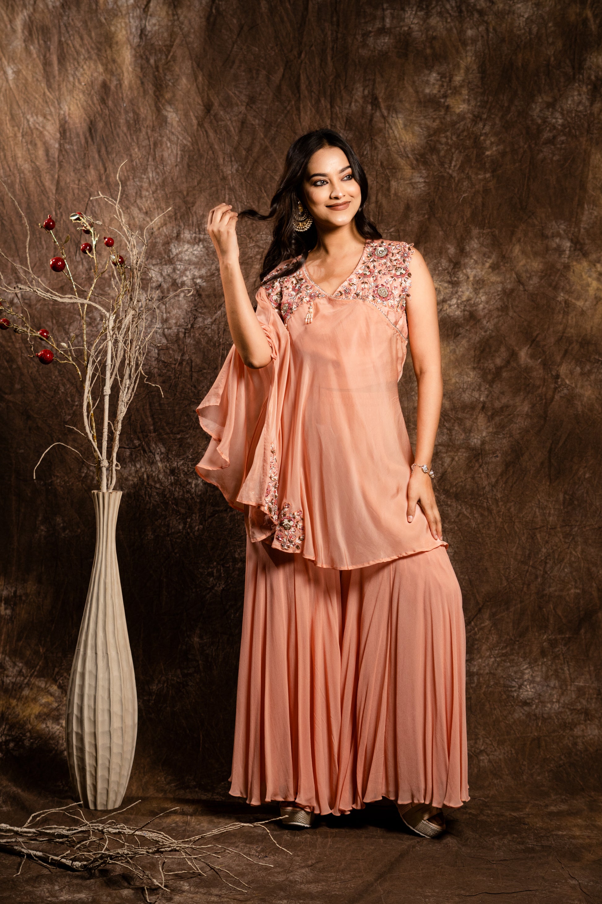 Expertly crafted with intricate hand embroidery, the Draped Set with Flaired Pants showcases a stunning organza layer paired with a short blouse and flaired pants. Elevate your style with this beautiful and unique ensemble.