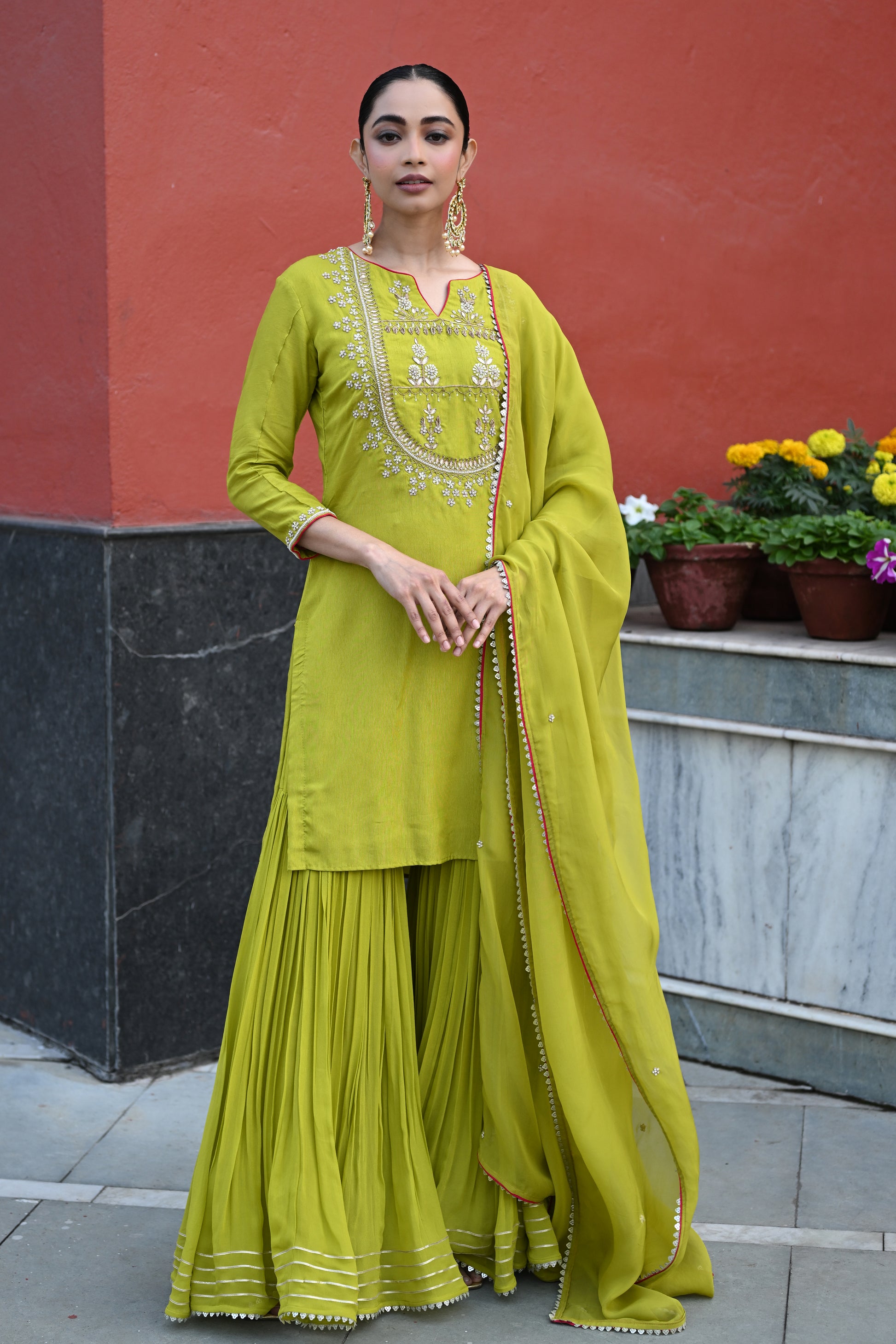 This elegant GREEN SHARARA SET features a stunning HEAVY TUNIC adorned with intricate AARI, DABKA, and PEARL embellishments on the neckline. Paired with a complementary SHARARA and DUPATTA, this set is perfect for any formal occasion. Made with high-quality materials, this set exudes luxury and sophistication.
