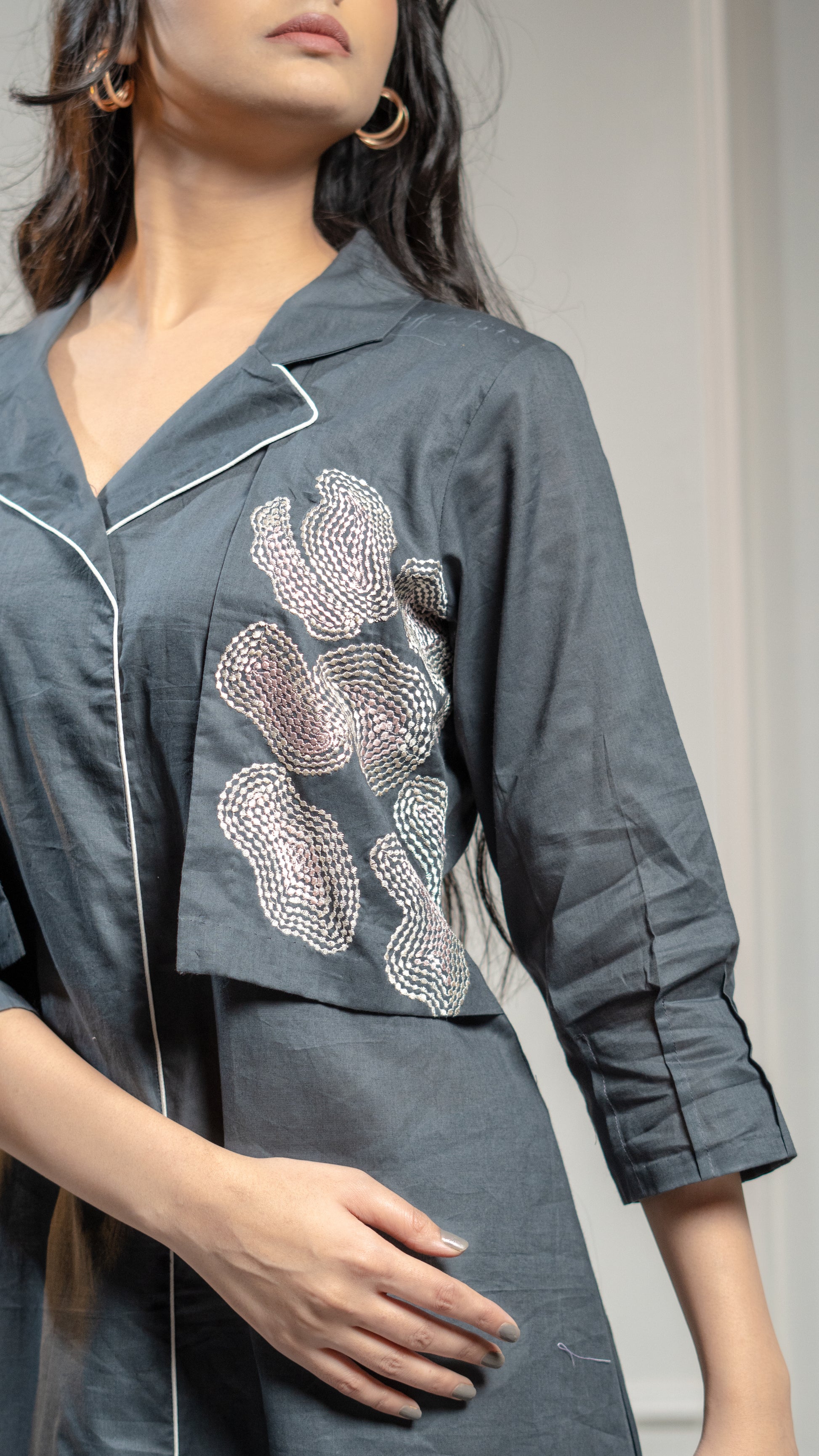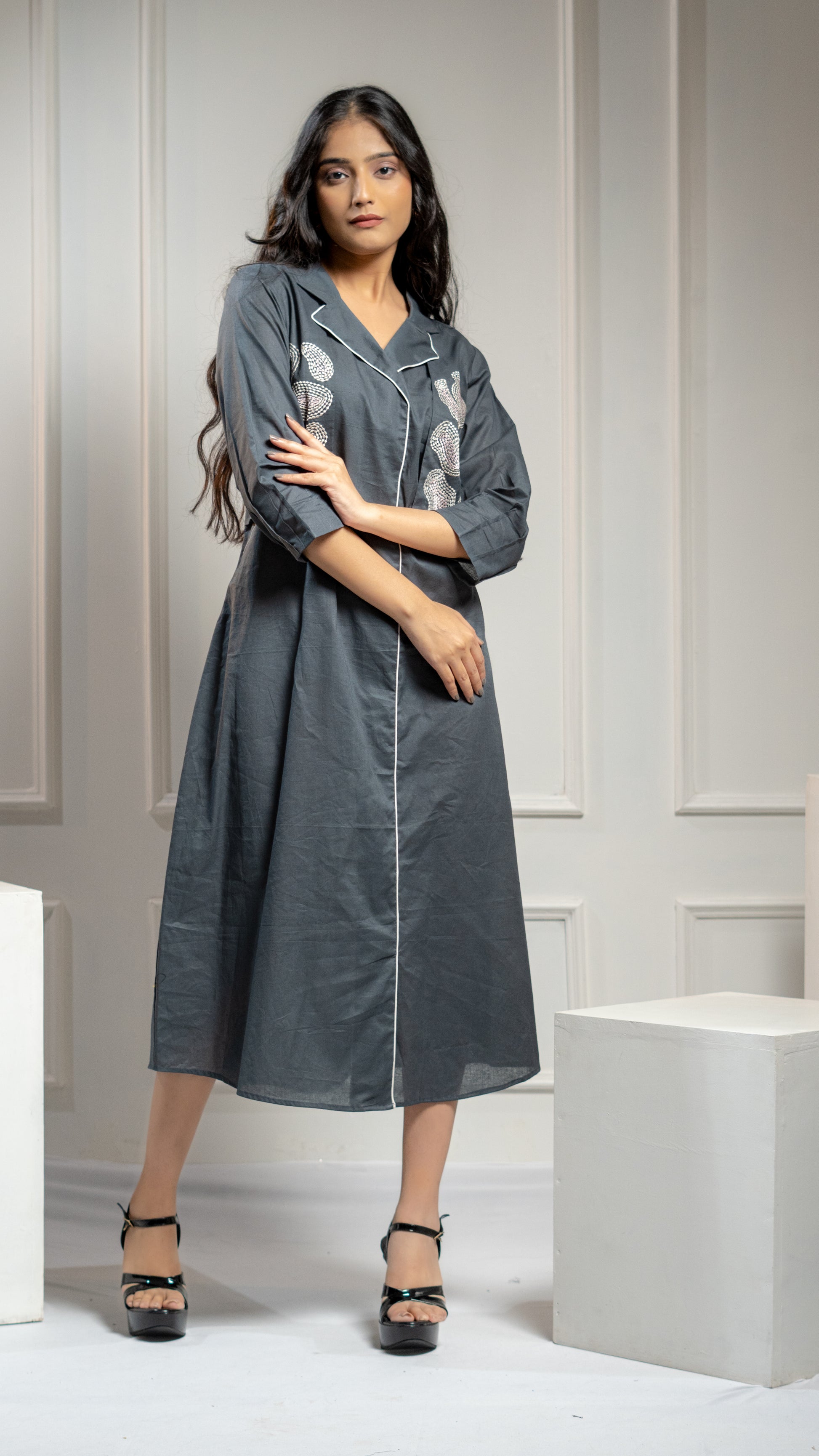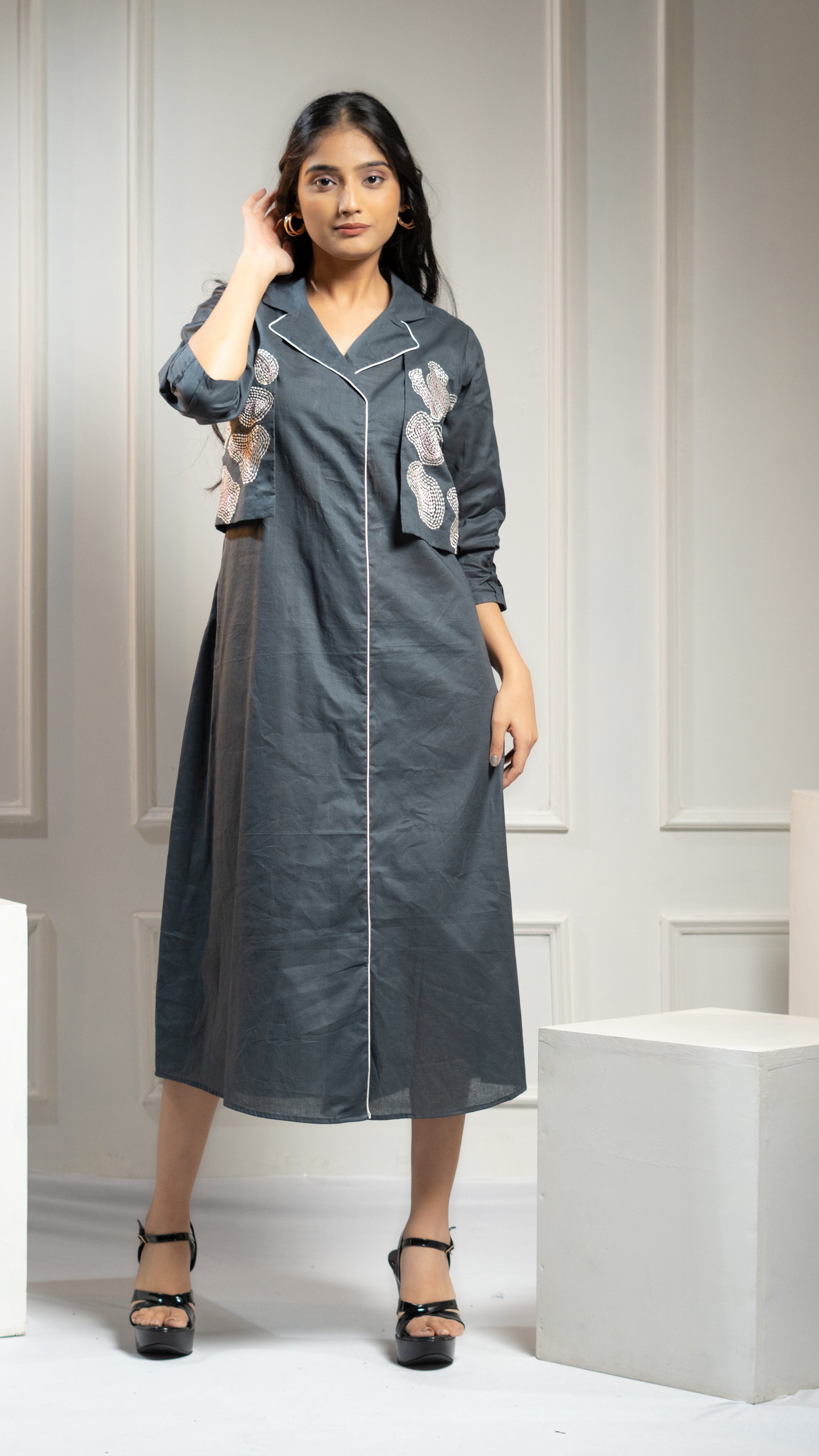 This jacket-style cotton dress is perfect for any occasion, combining smart and casual elements with its one-piece design. The jacket pattern adds a touch of elegance, enhanced by the intricate embroidery. Stay stylish and comfortable in this versatile dress.