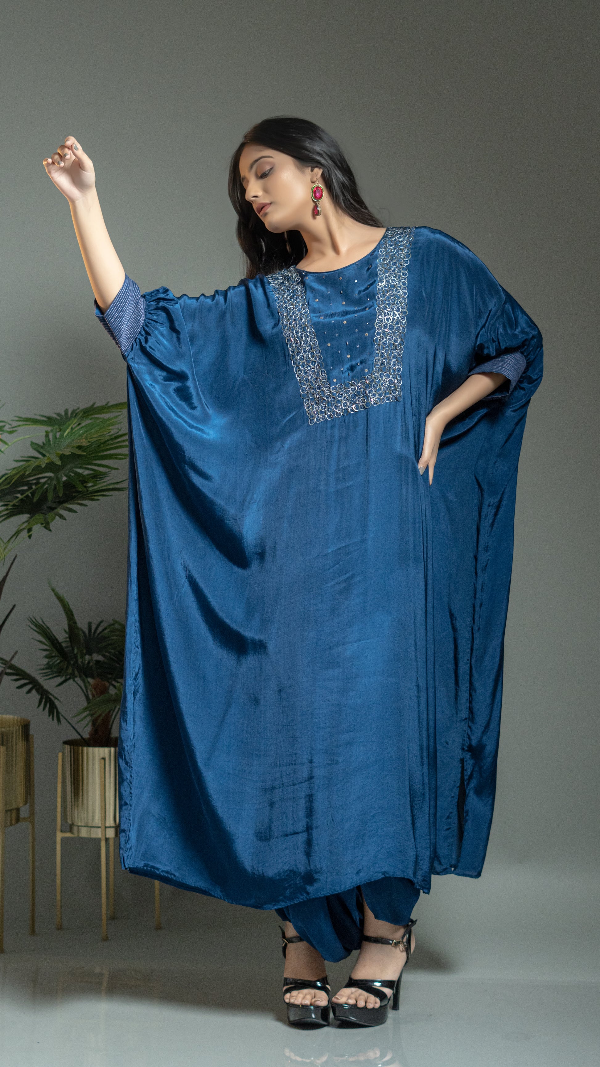 Expertly crafted from high-quality crepe material, this kaftan features modern hand embroidery for a unique and stylish touch. Paired with comfortable harem pants, this outfit offers both fashion and comfort in one. Elevate your wardrobe with this one-of-a-kind kaftan and harem pant set.
