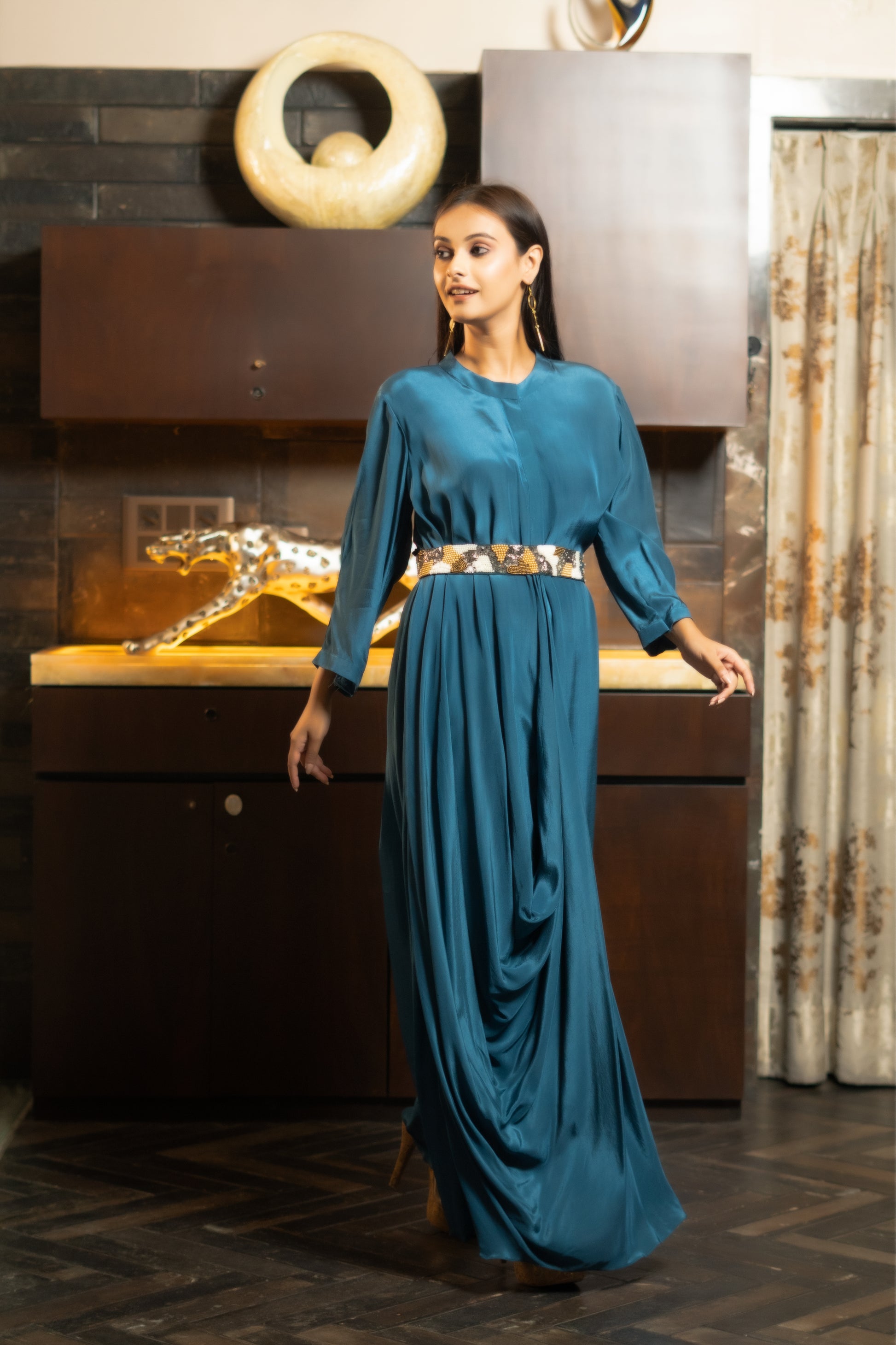 Expertly crafted with intricate embroidery on the belt, this Long Draped Dress combines traditional Indian design with a modern twist. The flowing silhouette and elegant draping create a flattering look, while the included belt adds definition to your waistline. Elevate your style with this unique piece.