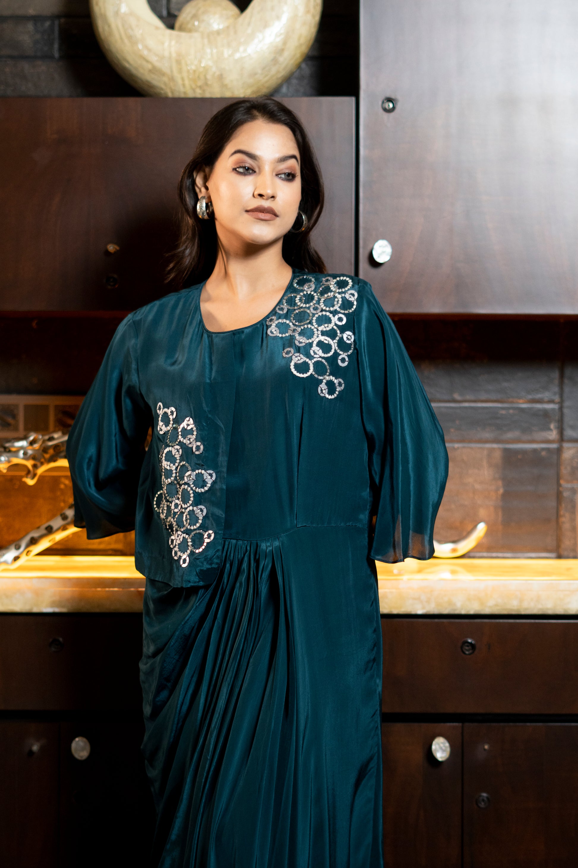 This stylish indowestern dress features a long, elegant design with a modern embroidered flap, giving it a unique touch. Perfect for any occasion, this dress combines traditional and contemporary elements for a timeless look.