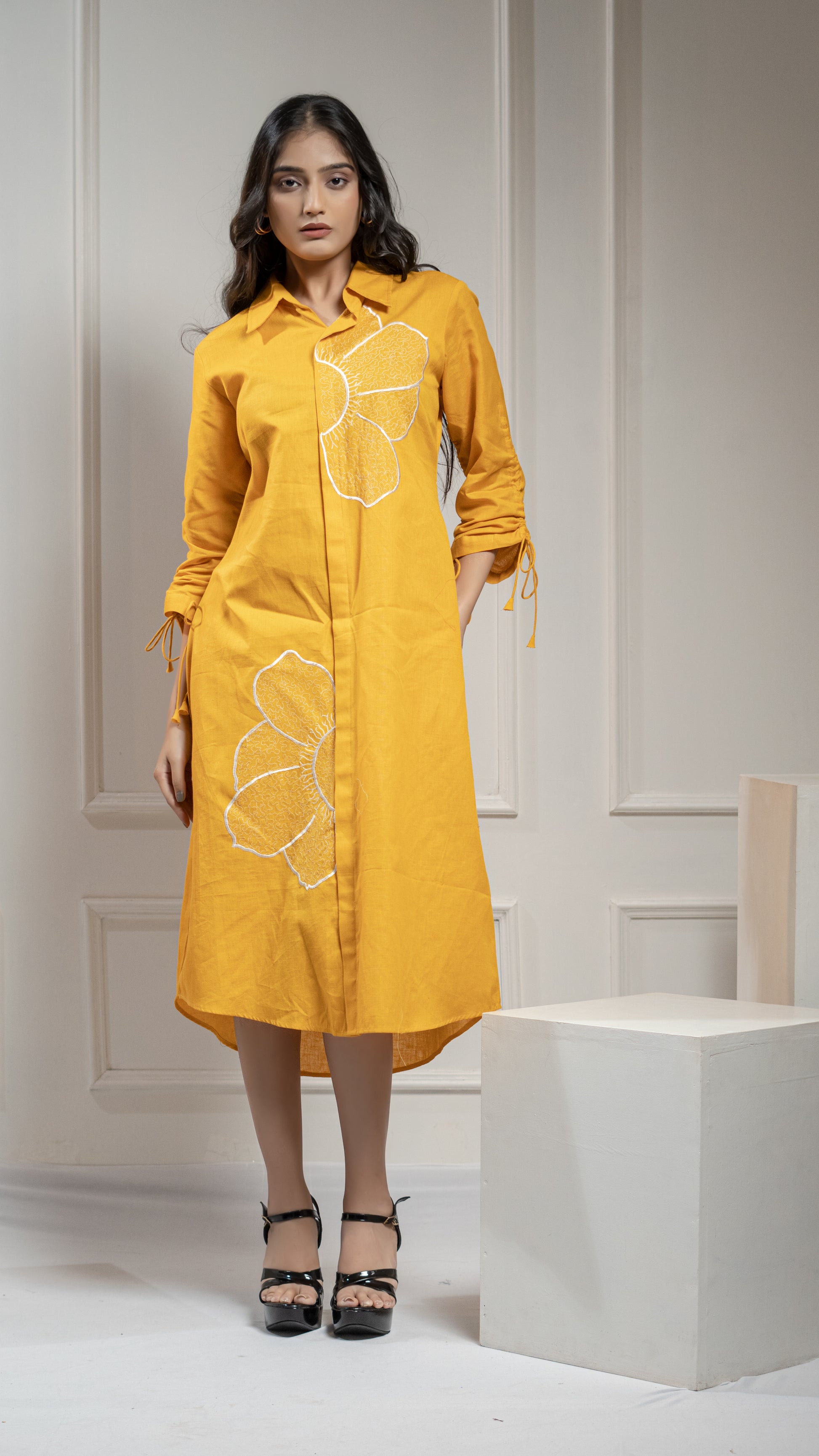 This MUSTRED YELLOW ONE PIECE DRESS is the perfect balance of smart and casual, with intricate floral embroidery and detailed sleeves. Elevate your wardrobe with this stylish and versatile dress. Made for any occasion, it offers a unique blend of elegance and comfort.