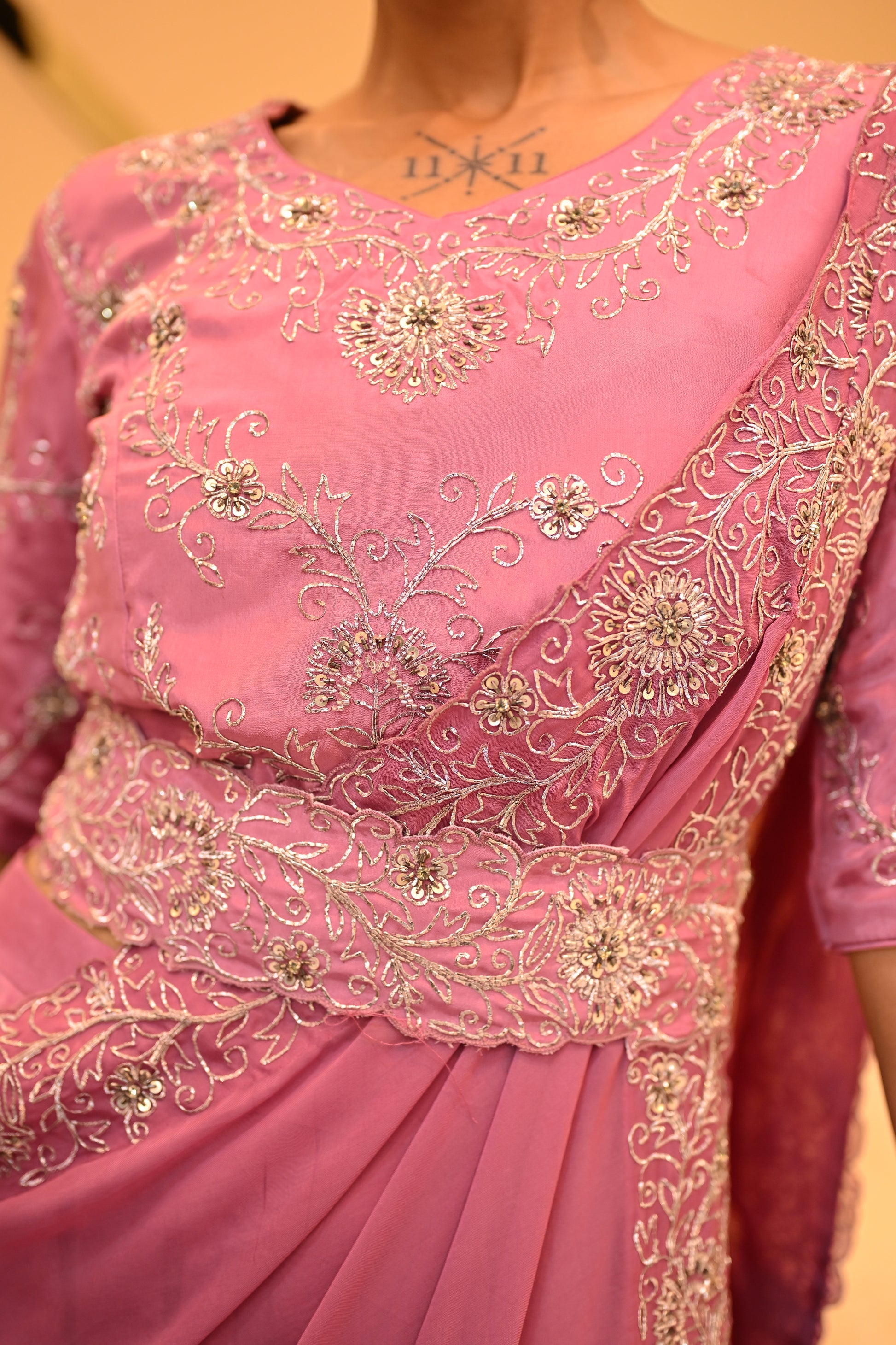 Elevate your style with our Salmon Pink Drape Saree with Belt. This stunning ensemble features a Dabka, Cheed, Stone, and Sequence embroidered blouse, along with a belt and pre-stitched draped dupatta for effortless elegance. Paired with a layered skirt, this saree is a perfect blend of traditional and modern fashion.