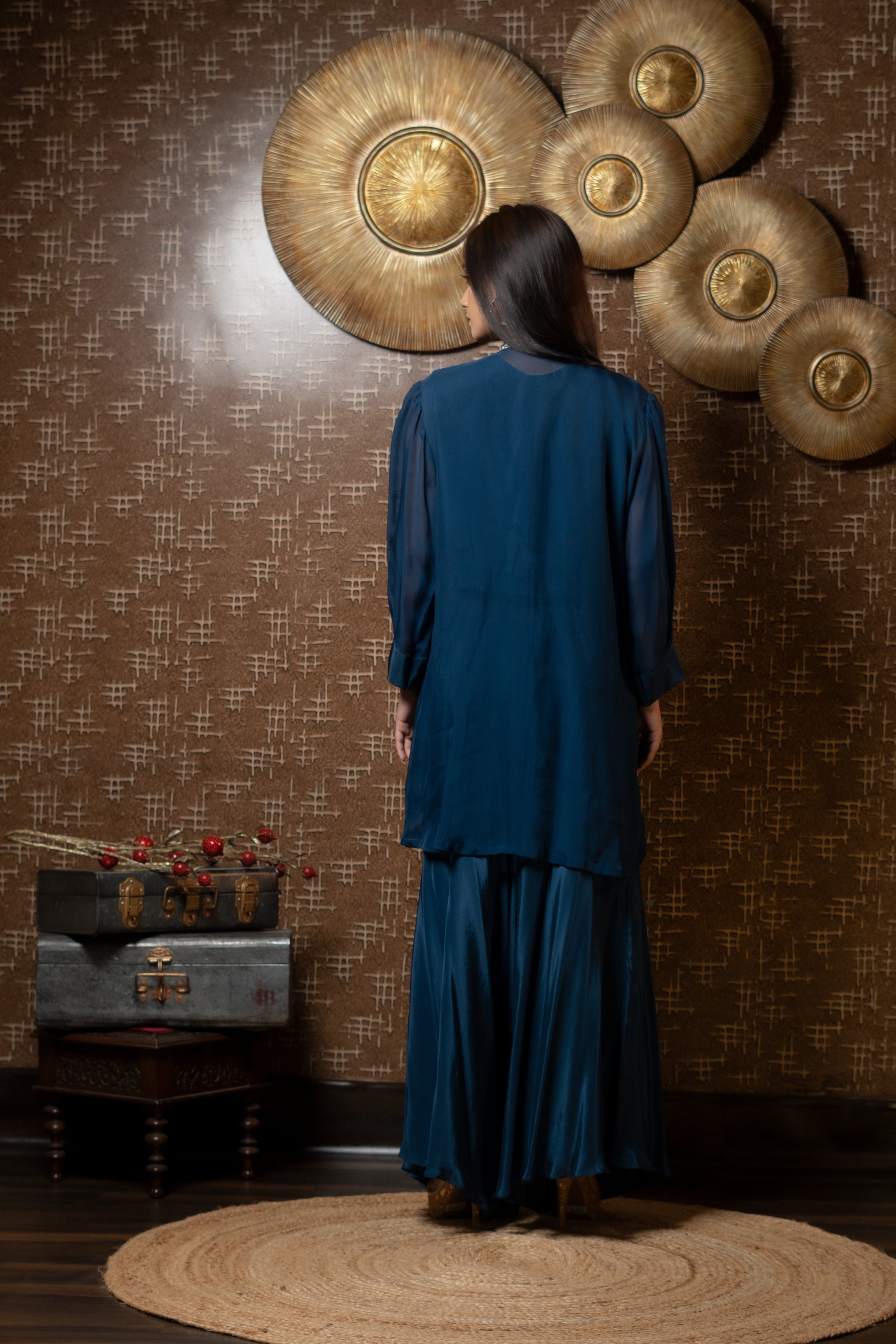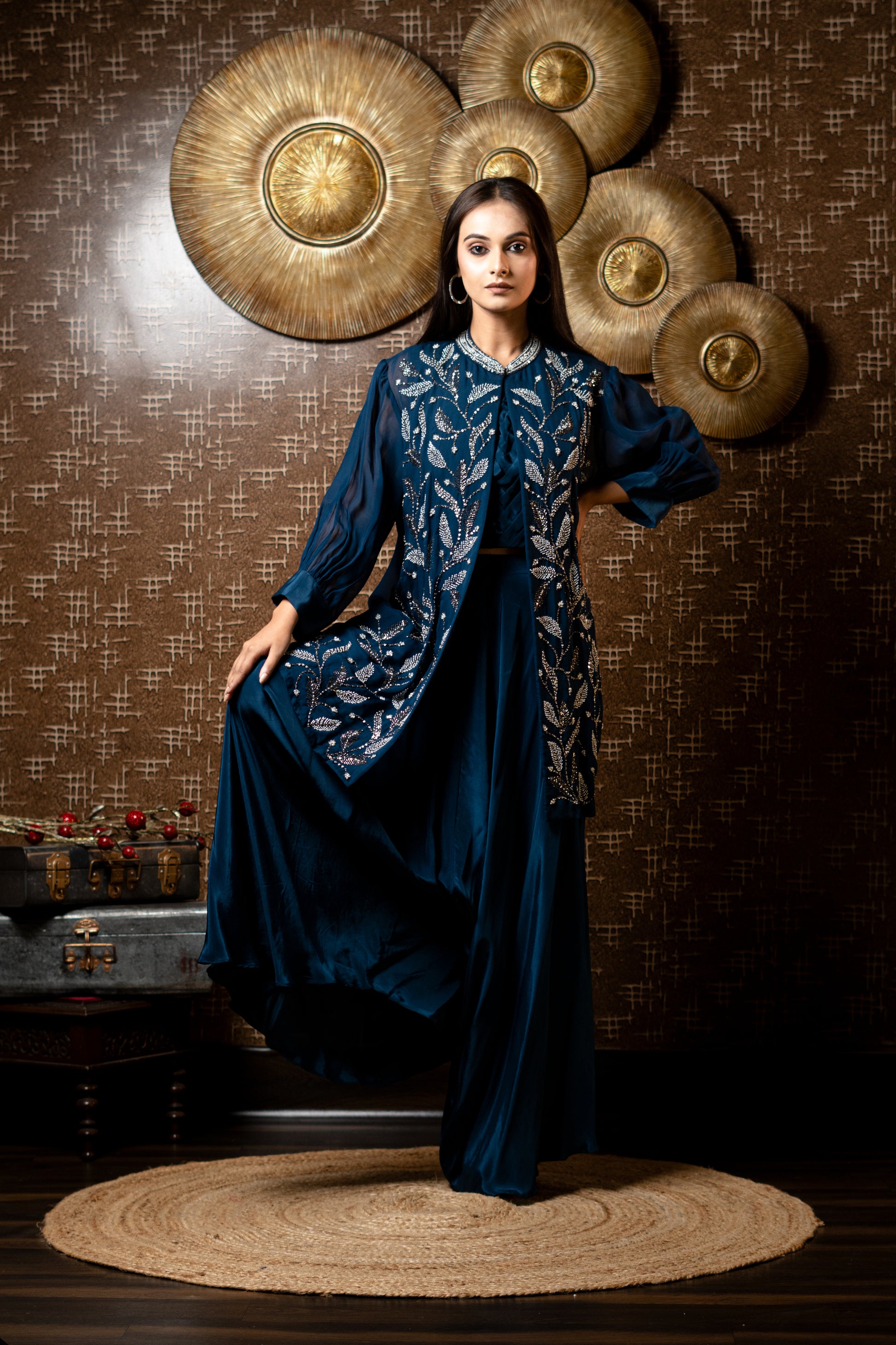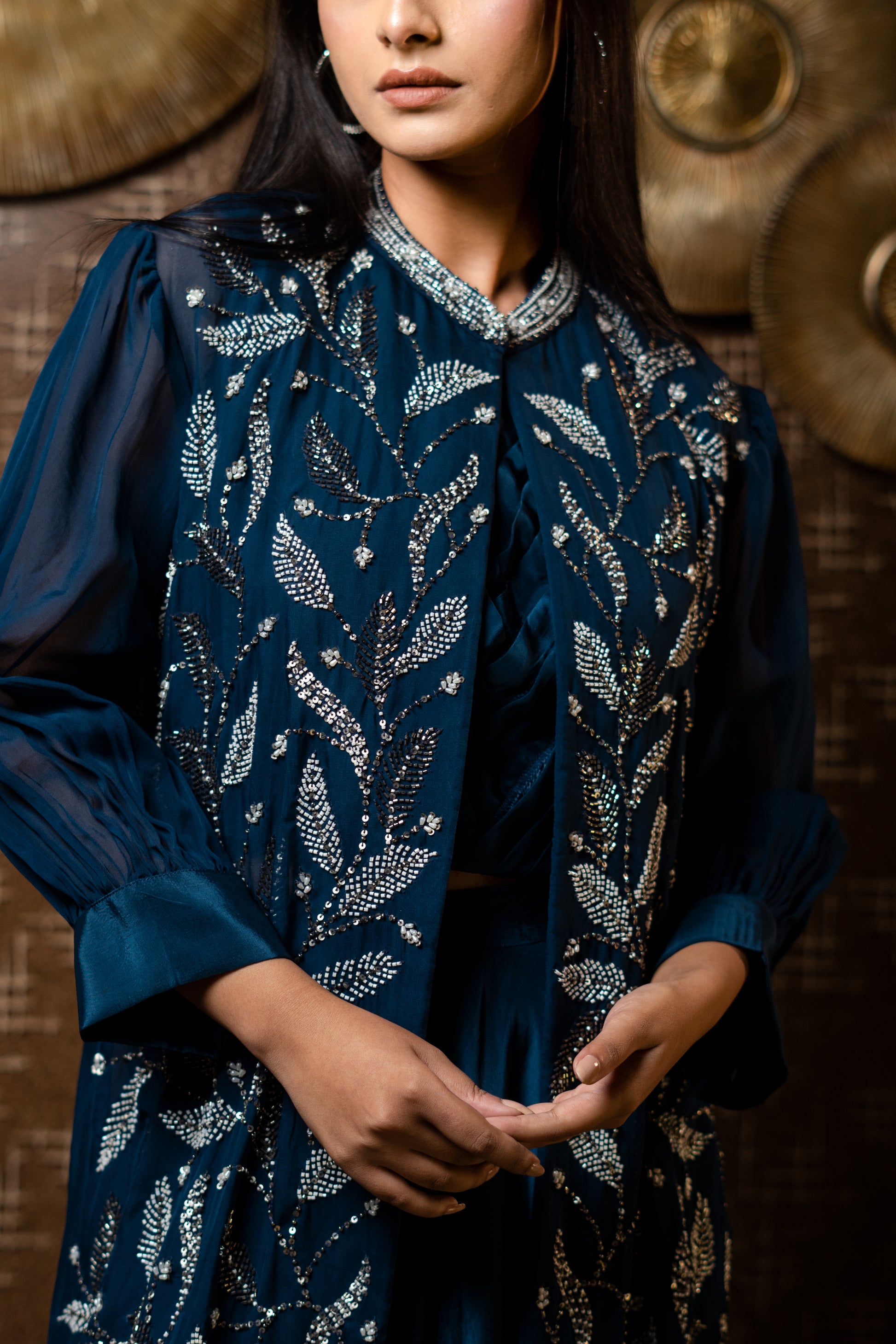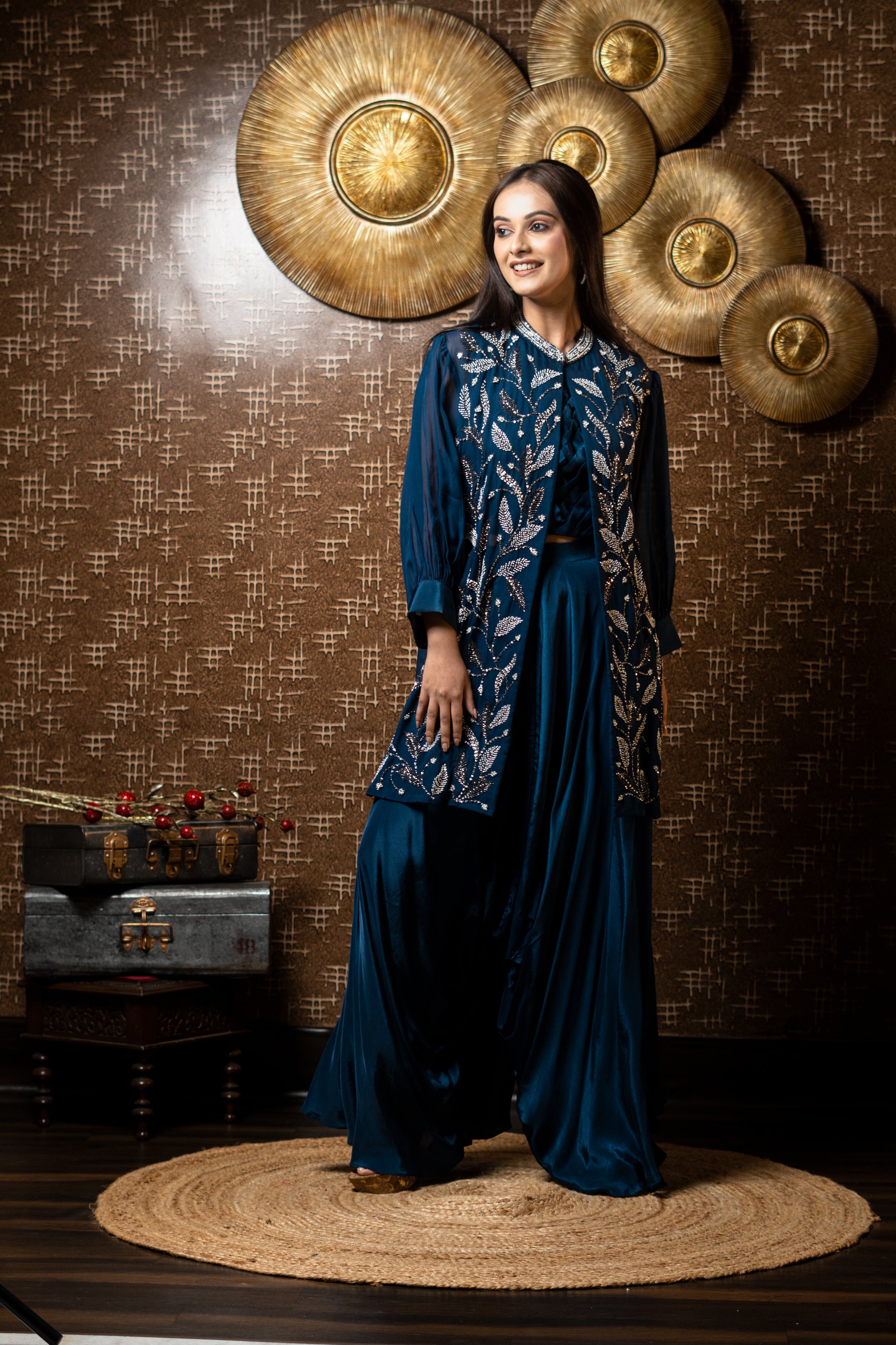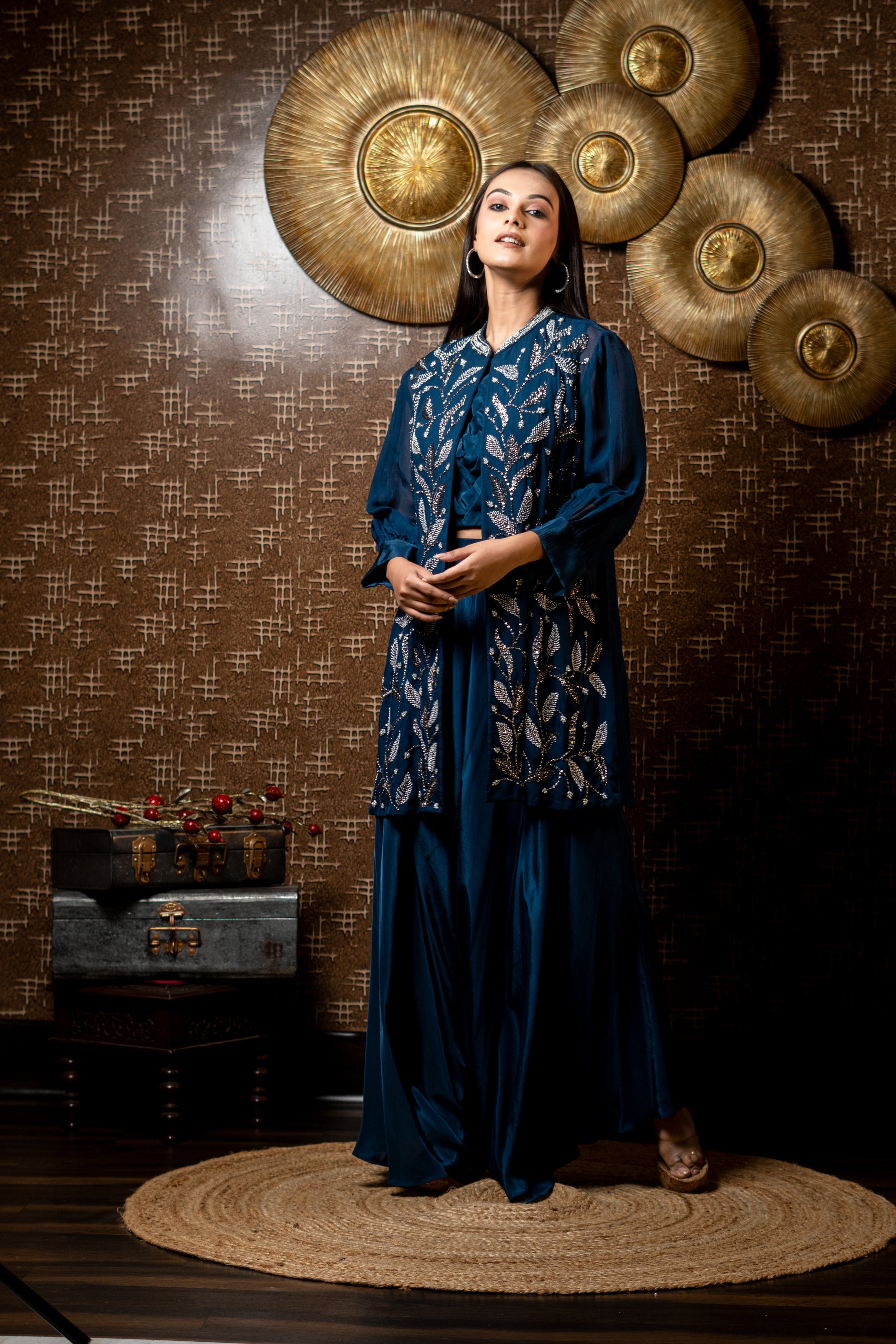 A versatile short jacket set, featuring a stunning pearl and dabka embroidery. The draped pants add a touch of elegance to the ensemble. Perfect for any occasion, this set adds a unique and sophisticated element to your wardrobe.