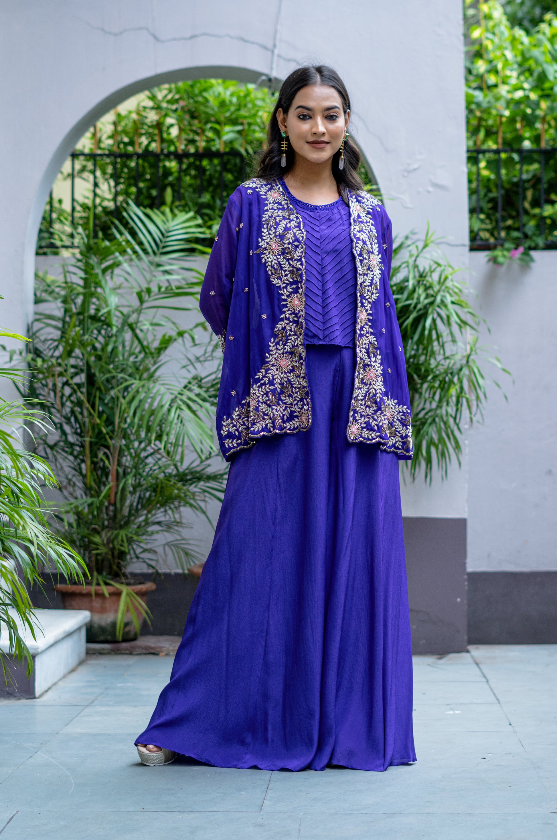 This organza short jacket features exquisite zardozi and pearl embroidery, adding a touch of elegance and luxury to your outfit. Paired with a stylish top and flared pants, this ensemble is perfect for any formal occasion. Elevate your wardrobe with this unique and sophisticated piece.