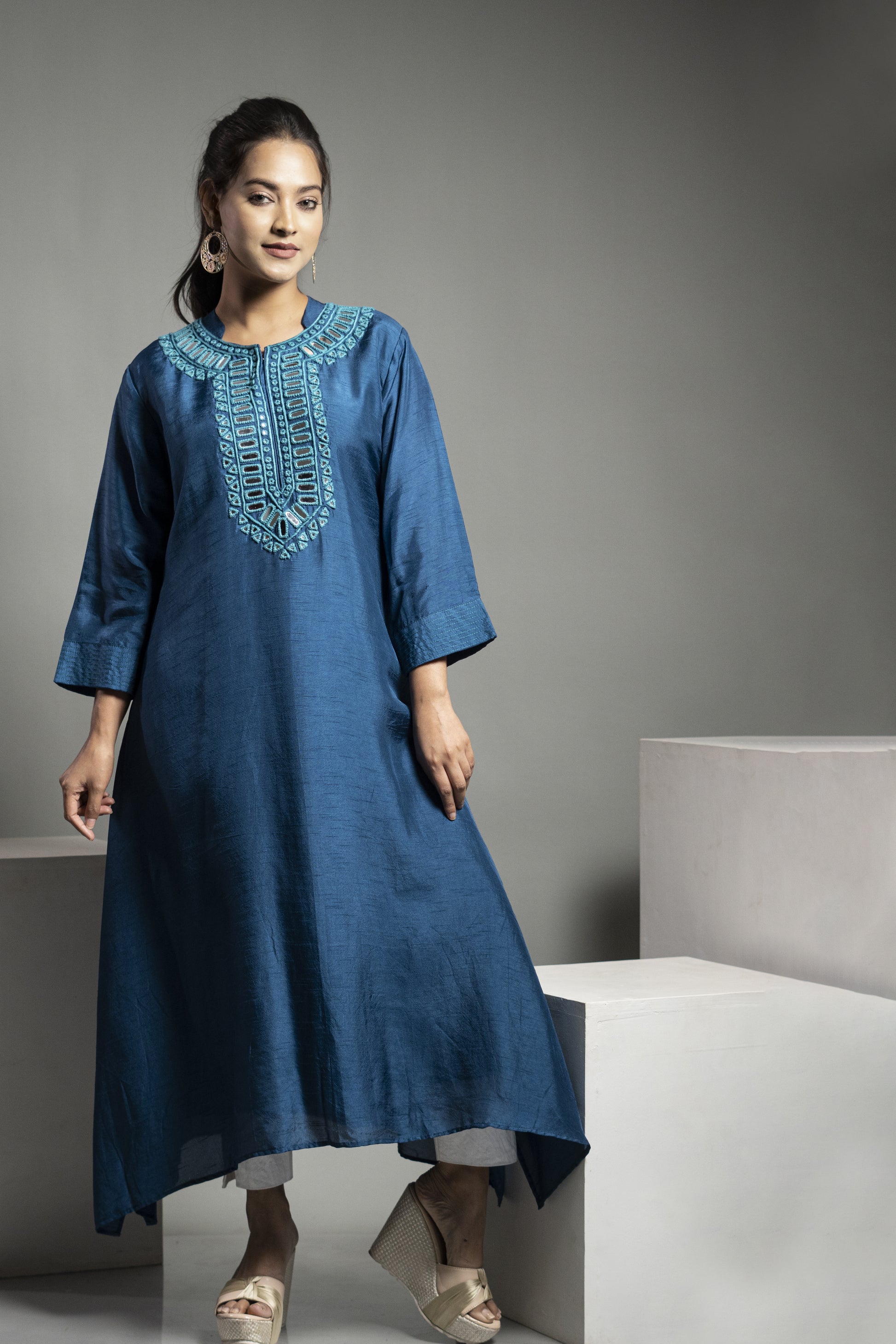 This exquisite silk kurta features a beautifully hand-embroidered neckline, adorned with intricate mirror and thread work. The luxurious fabric and detailed craftsmanship make for a truly one-of-a-kind piece. Elevate your wardrobe with this elegant and timeless addition.