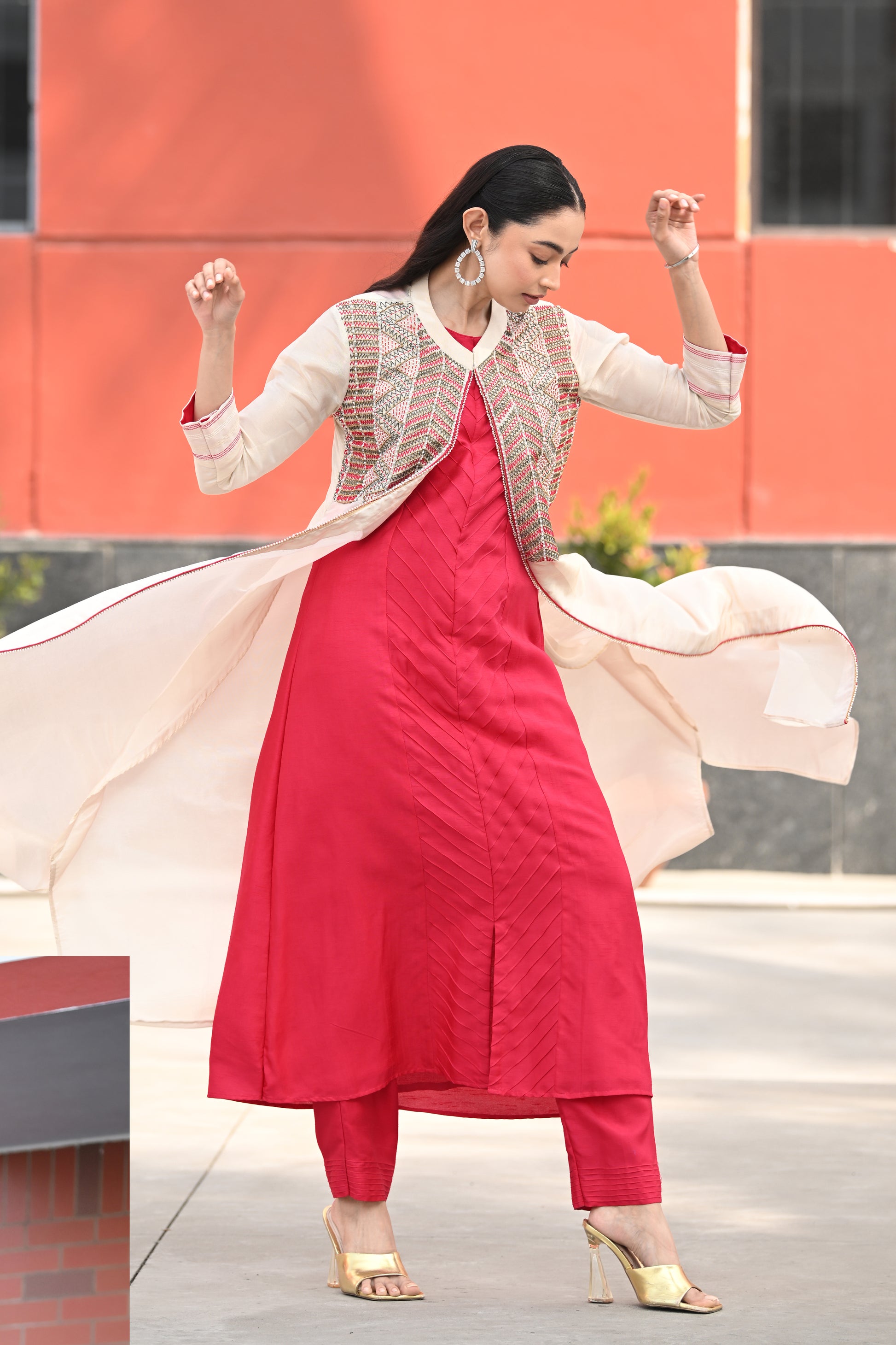 This TISSUE JACKET SET features an embellished jacket with intricate threadwork, cheed, dabka, and cutdana work. It comes with a fuschia pink inner and pants, adding a pop of color to your ensemble. Elevate your style and make a statement with this beautifully crafted set.